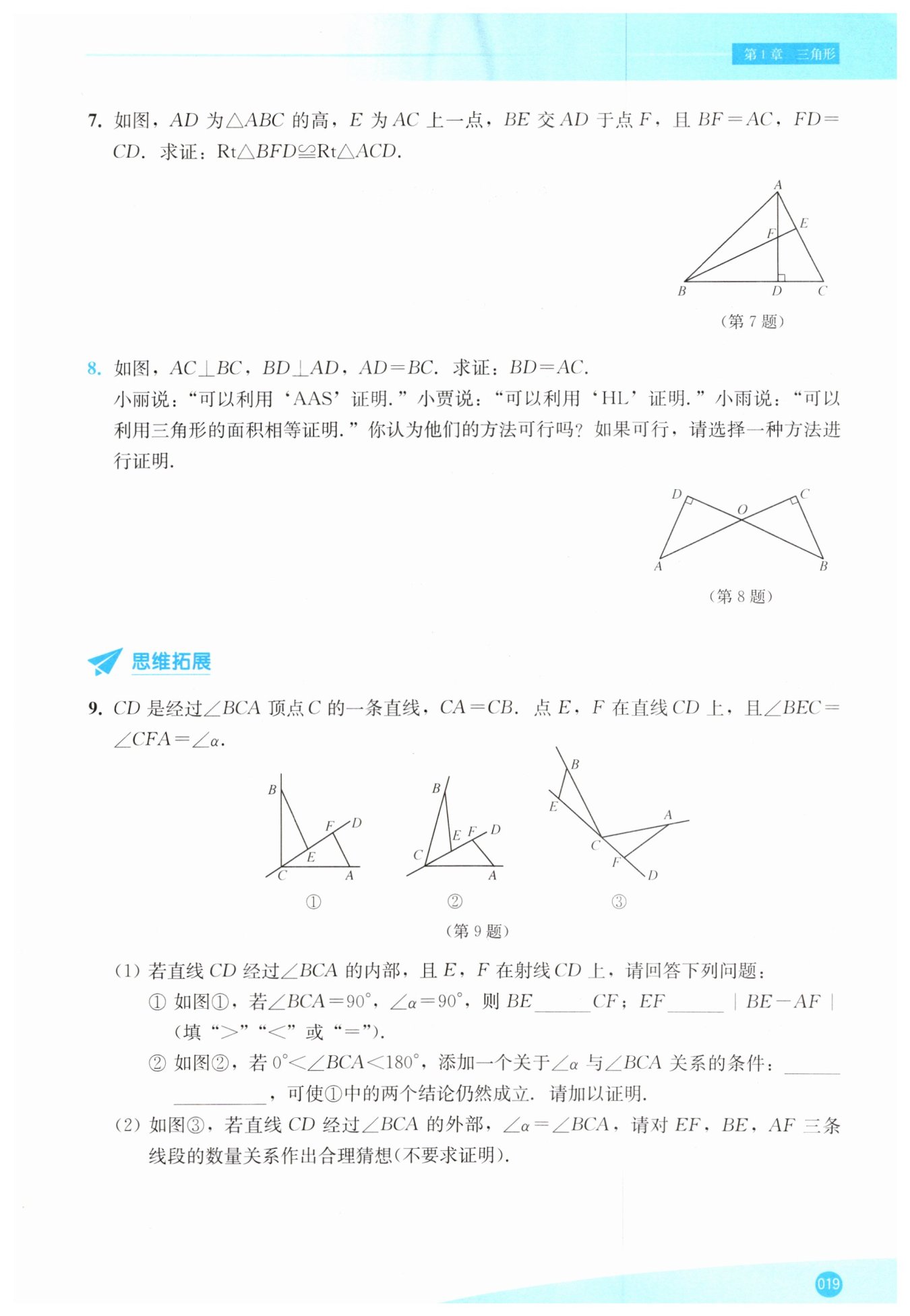 $\left\{\begin{array}{l} BF=AC \\ FD=CD \end{array}\right.,$ ∴Rt△BFD≌Rt△ACD(HL)。