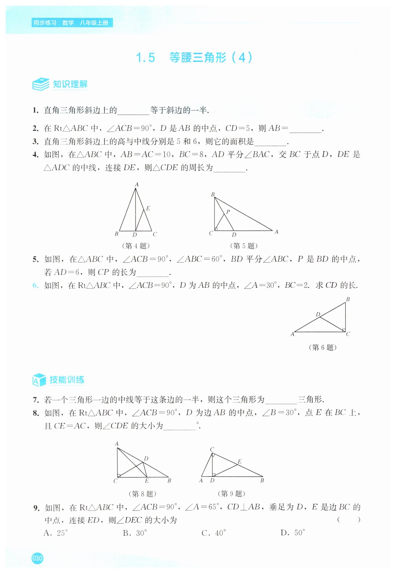 因為∠ACB=90°,∠A=30°,所以 BC= $\frac{1}{2}$AB,又 BC=2,則 AB=4.又 D 為 AB 的中點,則 CD= $\frac{1}{2}$AB=2