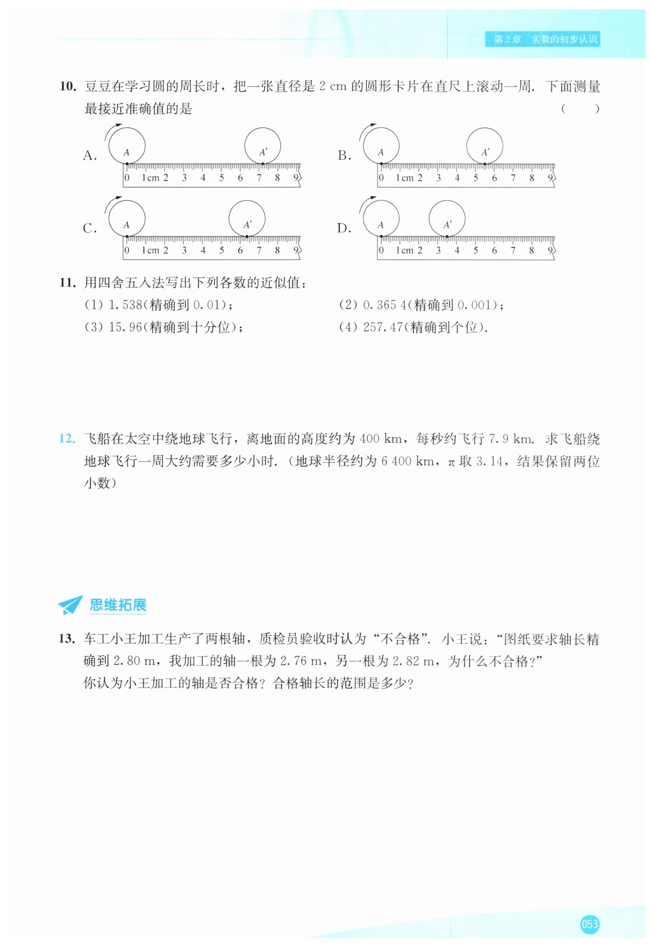 測量時,初始點$A$對準$0\,cm$,滾動一周后終點$A'$應(yīng)接近$6.28\,cm$。