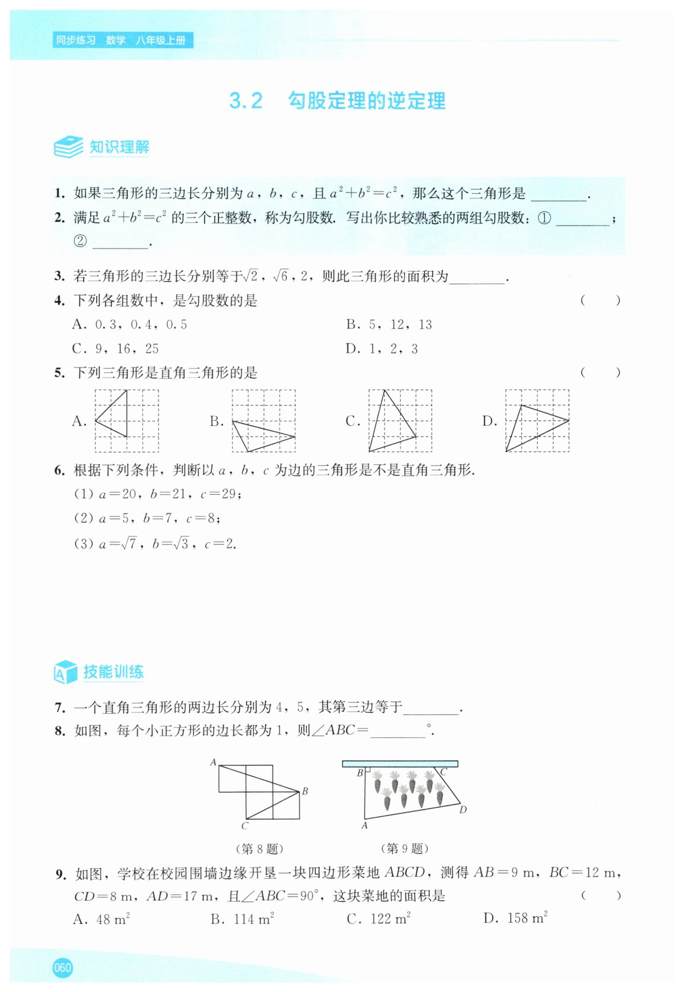 (1)$20^{2}+21^{2}=29^{2}$,是直角三角形 (2)$5^{2}+7^{2}\neq8^{2}$,不是直角三角形 (3)$(\sqrt{3})^{2}+2^{2}=(\sqrt{7})^{2}$,是直角三角形