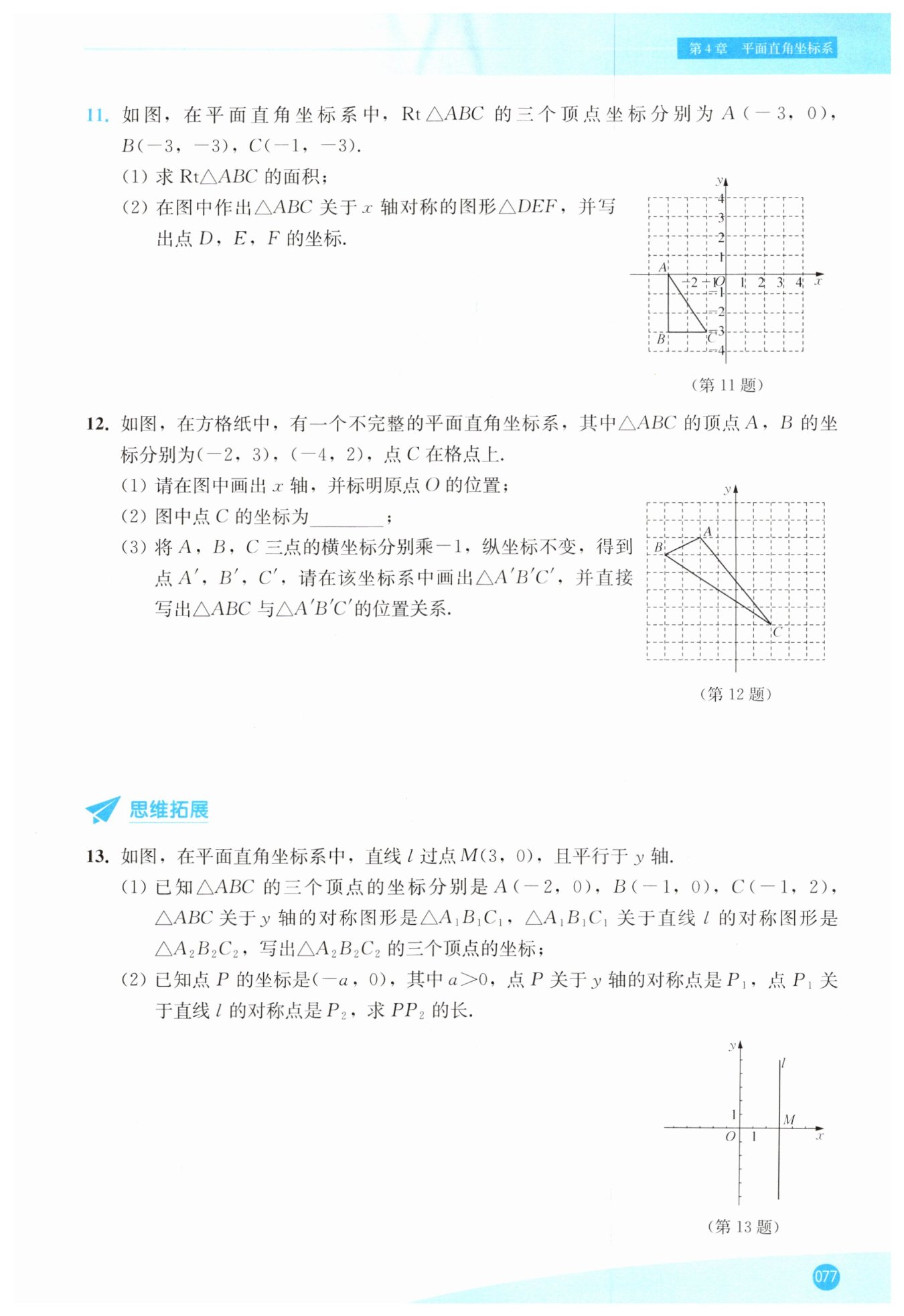 (1)已知$A(-3,0),$$B(-3,-3),$$C(-1,-3)。$因?yàn)?A$和$B$的橫坐標(biāo)相同,所以$AB$垂直于$x$軸,$AB$的長(zhǎng)度為$\vert0 - (-3)\vert = 3;$$B$和$C$的縱坐標(biāo)相同,所以$BC$平行于$x$軸,$BC$的長(zhǎng)度為$\vert-1 - (-3)\vert = 2。$由于$AB$垂直于$BC,$所以$Rt\triangle ABC$的面積為$\frac{1}{2} \times AB \times BC = \frac{1}{2} \times 3 \times 2 = 3。$ (2)關(guān)于$x$軸對(duì)稱的點(diǎn),橫坐標(biāo)不變,縱坐標(biāo)互為相反數(shù)。所以點(diǎn)$A(-3,0)$關(guān)于$x$軸對(duì)稱的點(diǎn)$D$的坐標(biāo)為$(-3,0);$點(diǎn)$B(-3,-3)$關(guān)于$x$軸對(duì)稱的點(diǎn)$E$的坐標(biāo)為$(-3,3);$點(diǎn)$C(-1,-3)$關(guān)于$x$軸對(duì)稱的點(diǎn)$F$的坐標(biāo)為$(-1,3)。$在圖中作出$\triangle DEF$(圖略)。 答案:(1)$3;$(2)$D(-3,0),$$E(-3,3),$$F(-1,3)$