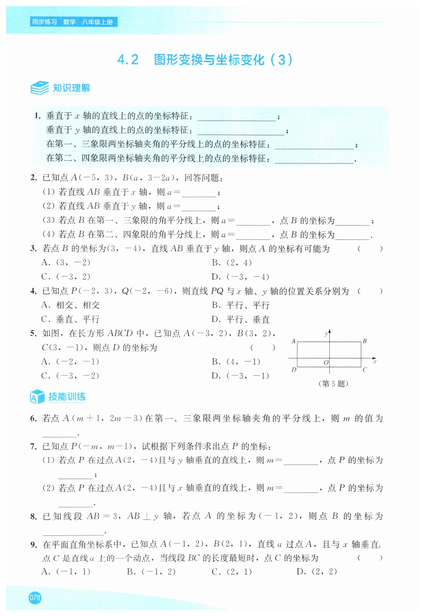 【解析】: (1)過點A(2,-4)且與y軸垂直的直線上的點縱坐標都為-4,所以m-1=-4,解得m=-3,點P的坐標為(3,-4); (2)過點A(2,-4)且與x軸垂直的直線上的點橫坐標都為2,所以-m=2,解得m=-2,點P的坐標為(2,-3)。