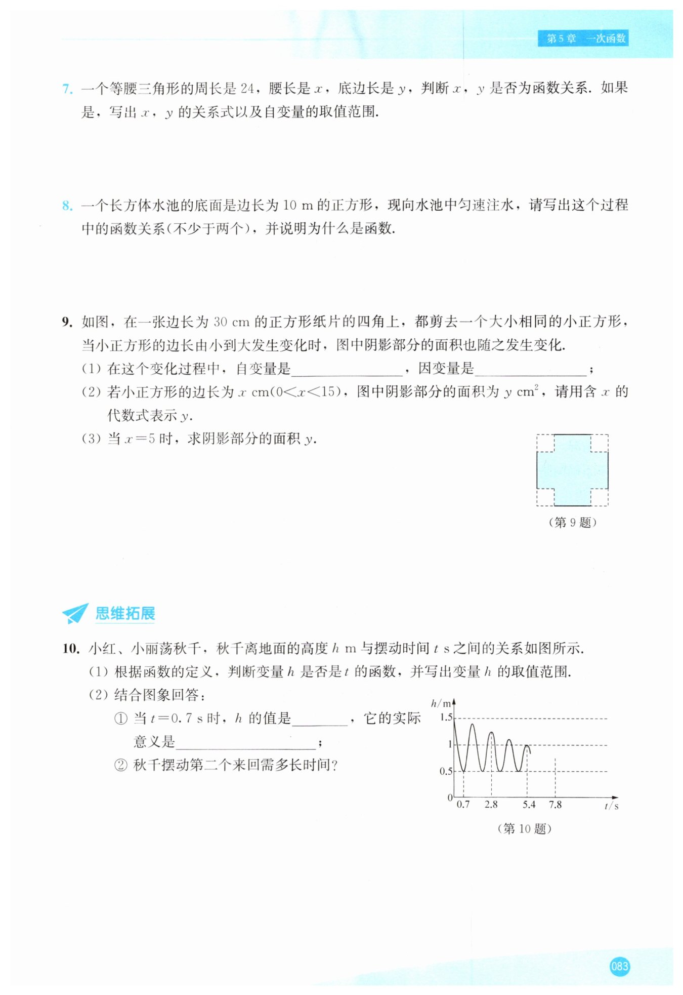 (1)自變量是小正方形的邊長,因變量是陰影部分的面積 (2)由于陰影部分的面積等于大正方形的面積減去4個(gè)小正方形的面積,所以可得$y=30^{2}-4x^{2}=900-4x^{2}$ (3)當(dāng)$x=5$時(shí),$y=900-4×25=800(cm^{2})$