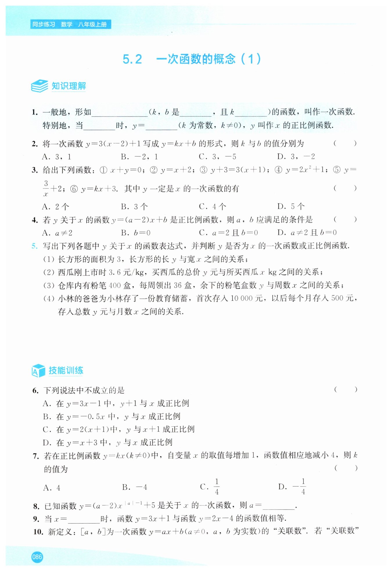 (2)總價(jià)=單價(jià)×數(shù)量,西瓜單價(jià)3.6元/kg,所以$y=3.6x。$此函數(shù)符合一次函數(shù)$y=kx+b$($b=0$)的形式,也符合正比例函數(shù)形式,所以$y=3.6x,$是一次函數(shù),也是正比例函數(shù);