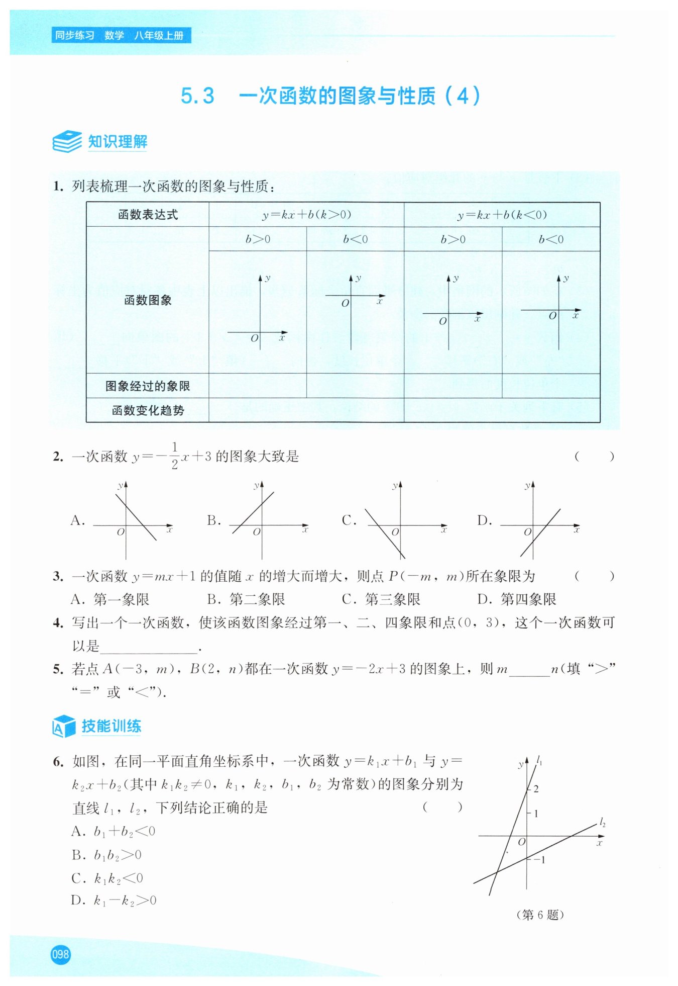 1. 圖略,一、二、三,一、三、四,一、二、四,二、三、四,y 隨 x 的增大而增大,y 隨 x 的增大而減小 2. A