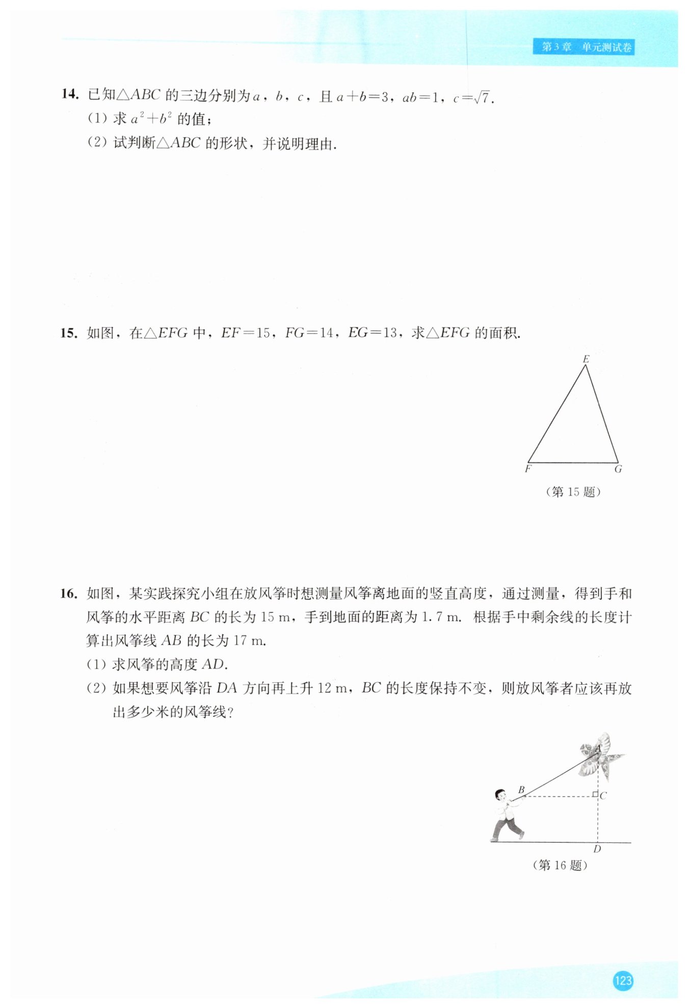 (1)在$Rt\triangle ABC$中,$\angle ACB=90^{\circ},$$BC=15m,$$AB=17m,$由勾股定理,得$AC=\sqrt{AB^{2}-BC^{2}}=\sqrt{17^{2}-15^{2}}=8m。$因為手到地面的距離$CD=1.7m,$所以風(fēng)箏的高度$AD=AC + CD=8 + 1.7=9.7m。$