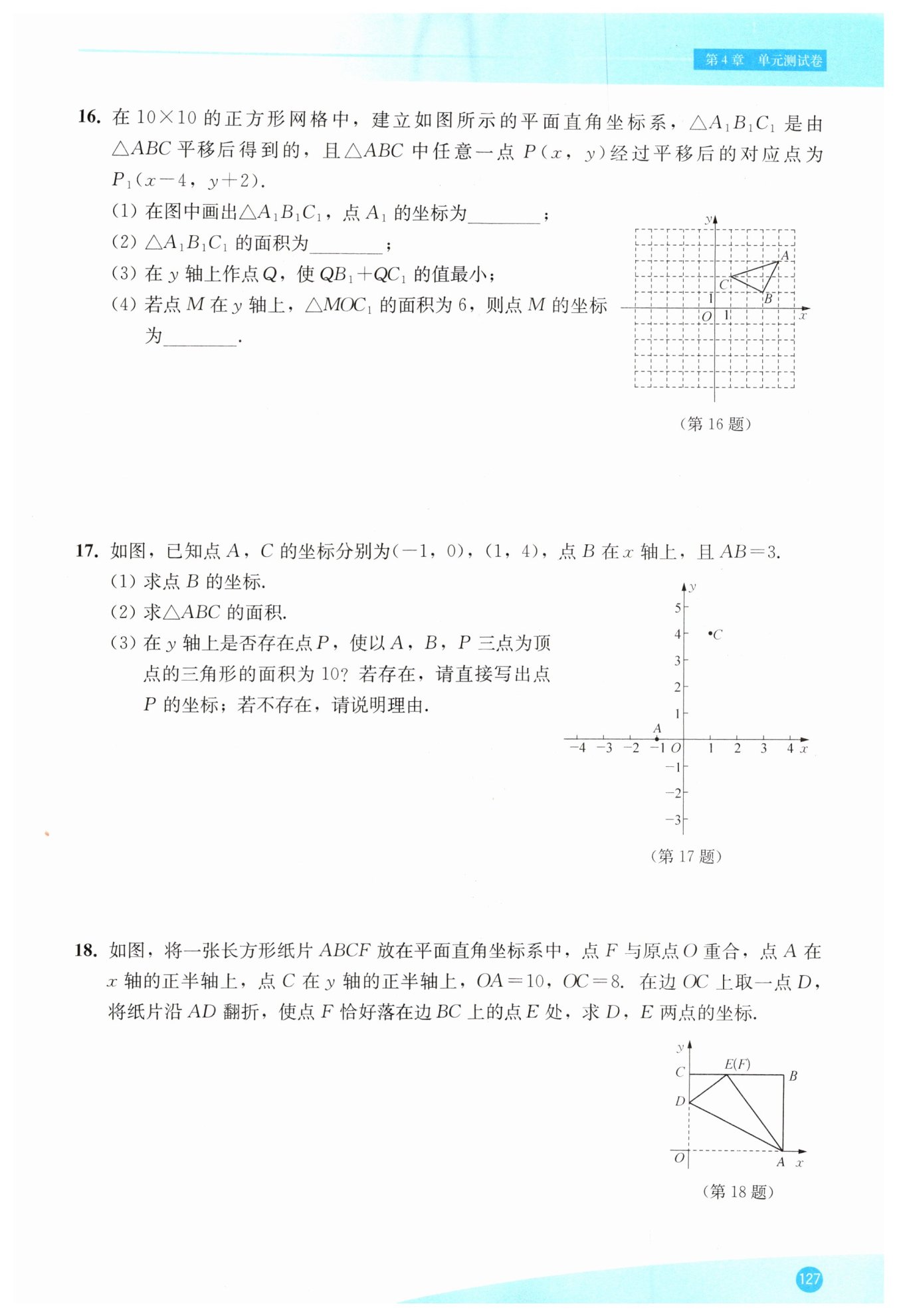 根據(jù)四邊形OABC是長方形,OA=10,OC=8,可知∠B=∠OCB=90°,BC=OA=10,AB=OC=8,由翻折得AE=OA=10,DE=OD.在Rt△ABE中,由勾股定理,得BE=6,所以CE=4,所以點(diǎn)E的坐標(biāo)為(4,8).設(shè)DE=OD=y,則CD=OC-OD=8-y.在Rt△CDE中,由勾股定理,得CD2+CE2=DE2,所以(8-y)2+42=y2,解得y=5.所以O(shè)D=5,所以點(diǎn)D的坐標(biāo)為(0,5)
