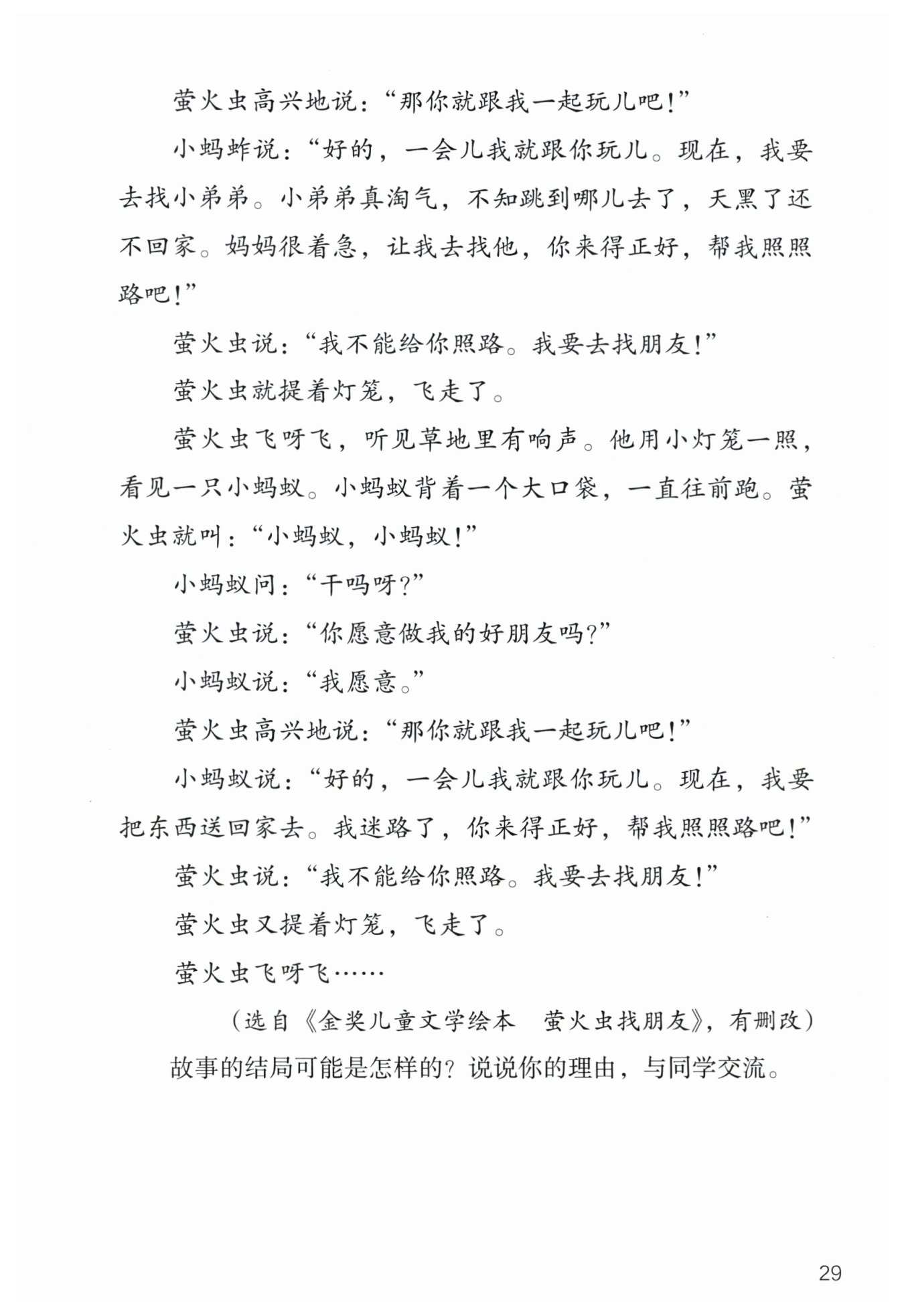 我預(yù)測(cè)的結(jié)局:螢火蟲(chóng)飛呀飛,飛了好久還是沒(méi)有找到朋友。它有些沮喪地停在一片樹(shù)葉上,回想起之前小螞蚱和小螞蟻?zhàn)屗鼛兔φ章?,自己卻拒絕了,心里很不是滋味。它想:如果我當(dāng)時(shí)幫助了它們,是不是現(xiàn)在就有朋友了。于是,螢火蟲(chóng)決定回去找小螞蚱和小螞蟻。它找到小螞蚱時(shí),小螞蚱還在著急地尋找小弟弟,螢火蟲(chóng)說(shuō):“我來(lái)幫你照路吧?!痹谖灮鹣x(chóng)的幫助下,小螞蚱很快找到了小弟弟。接著,螢火蟲(chóng)又去幫小螞蟻,讓小螞蟻?lái)樌氐搅思摇P∥涷坪托∥浵伓己芨兄x螢火蟲(chóng),它們一起玩耍,螢火蟲(chóng)終于找到了朋友,開(kāi)心極了。