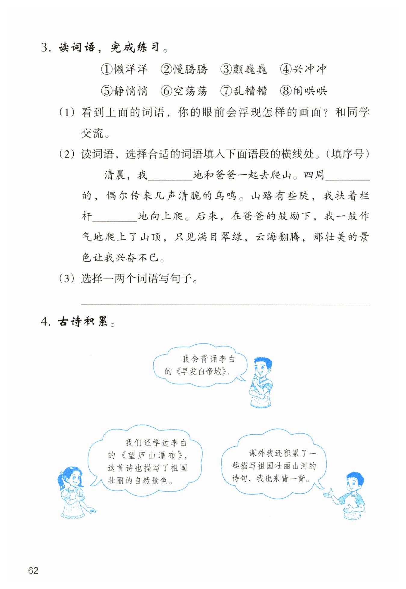 (1) 看到這些詞語,我的眼前浮現(xiàn)出了各種生動(dòng)的畫面。比如“懶洋洋”可以讓我聯(lián)想到一只小貓?jiān)陉柟庀裸紤械靥芍?;“慢騰騰”可以讓我聯(lián)想到一位老人在公園里悠閑地散步;“顫巍巍”可以讓我聯(lián)想到一個(gè)小孩手捧果凍,小心翼翼地走著,生怕果凍掉下來;“興沖沖”可以讓我聯(lián)想到一個(gè)小朋友得到了一張游樂園的門票,興高采烈地跑向游樂園等等。