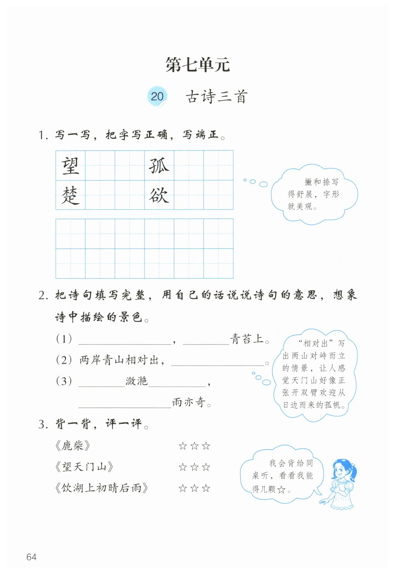 【解析】:本題主要考查對(duì)古詩(shī)的背誦以及理解能力。從題目所給信息可知,需要背誦《鹿柴》《望天門山》《飲湖上初晴后雨》這三首古詩(shī),然后根據(jù)背誦情況給自己評(píng)定星級(jí)。背誦古詩(shī)是語(yǔ)文學(xué)習(xí)中的常見任務(wù),有助于積累語(yǔ)言素材、感受古典文學(xué)的魅力。在背誦時(shí),可先理解古詩(shī)的大致意思,再反復(fù)誦讀,這樣有助于記憶。