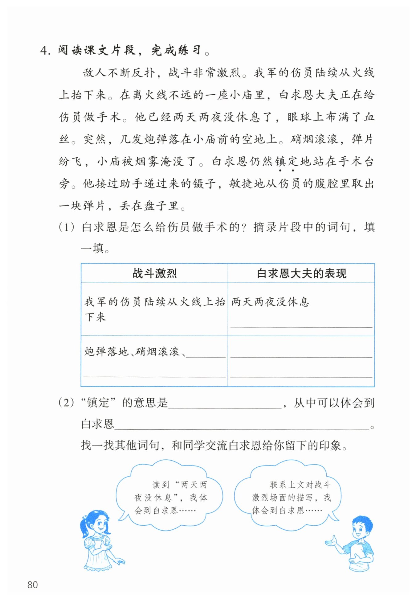 (2) 這道題主要考查對詞語的理解以及對人物形象的分析。先要解釋“鎮(zhèn)定”的意思,再結(jié)合文本體會(huì)白求恩的品質(zhì),并通過其他詞句進(jìn)一步交流對白求恩的印象。