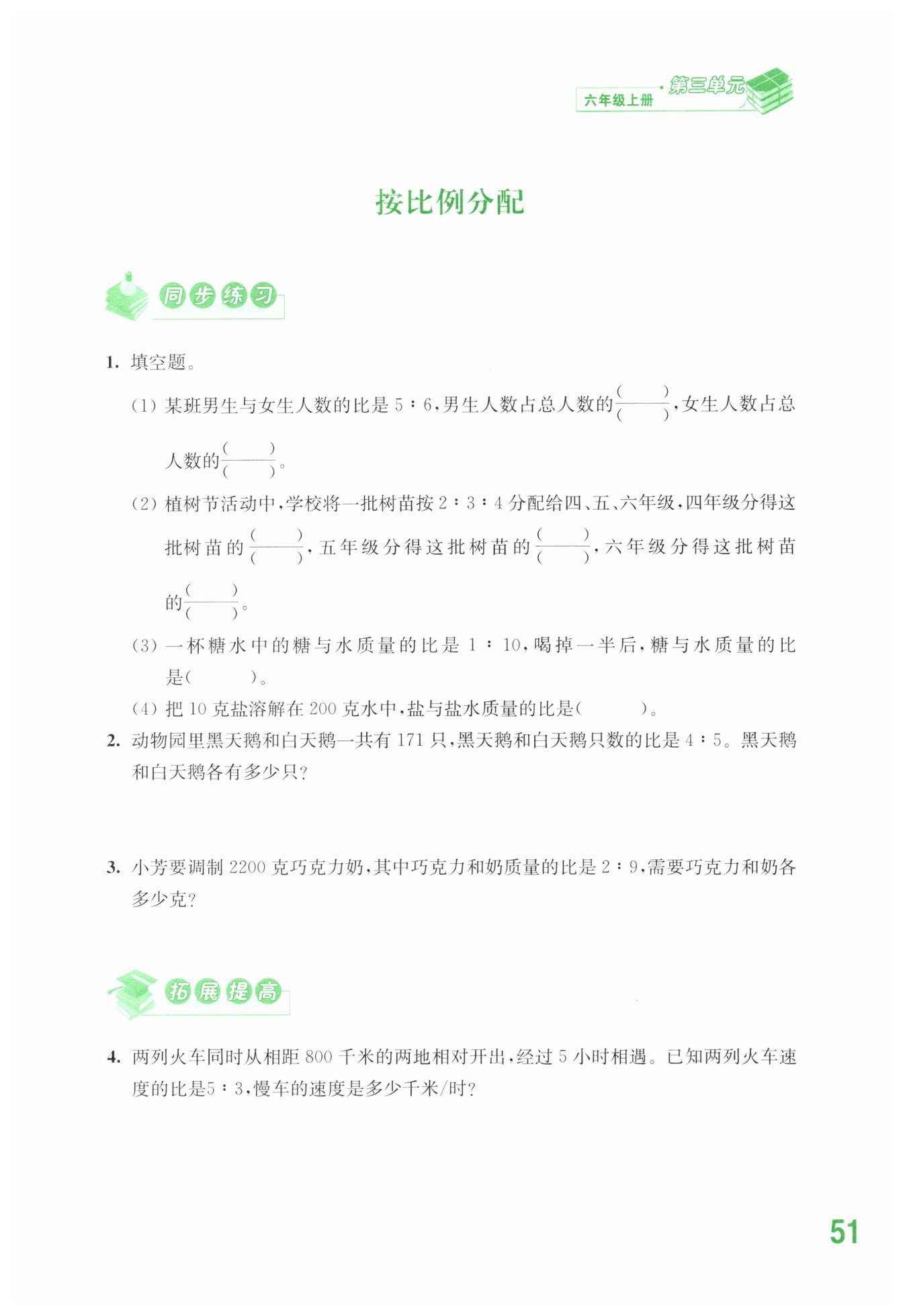 總份數(shù):2+9=11(份) 每份質(zhì)量:2200÷11=200(克) 巧克力:200×2=400(克) 奶:200×9=1800(克) 答:需要巧克力400克,奶1800克。