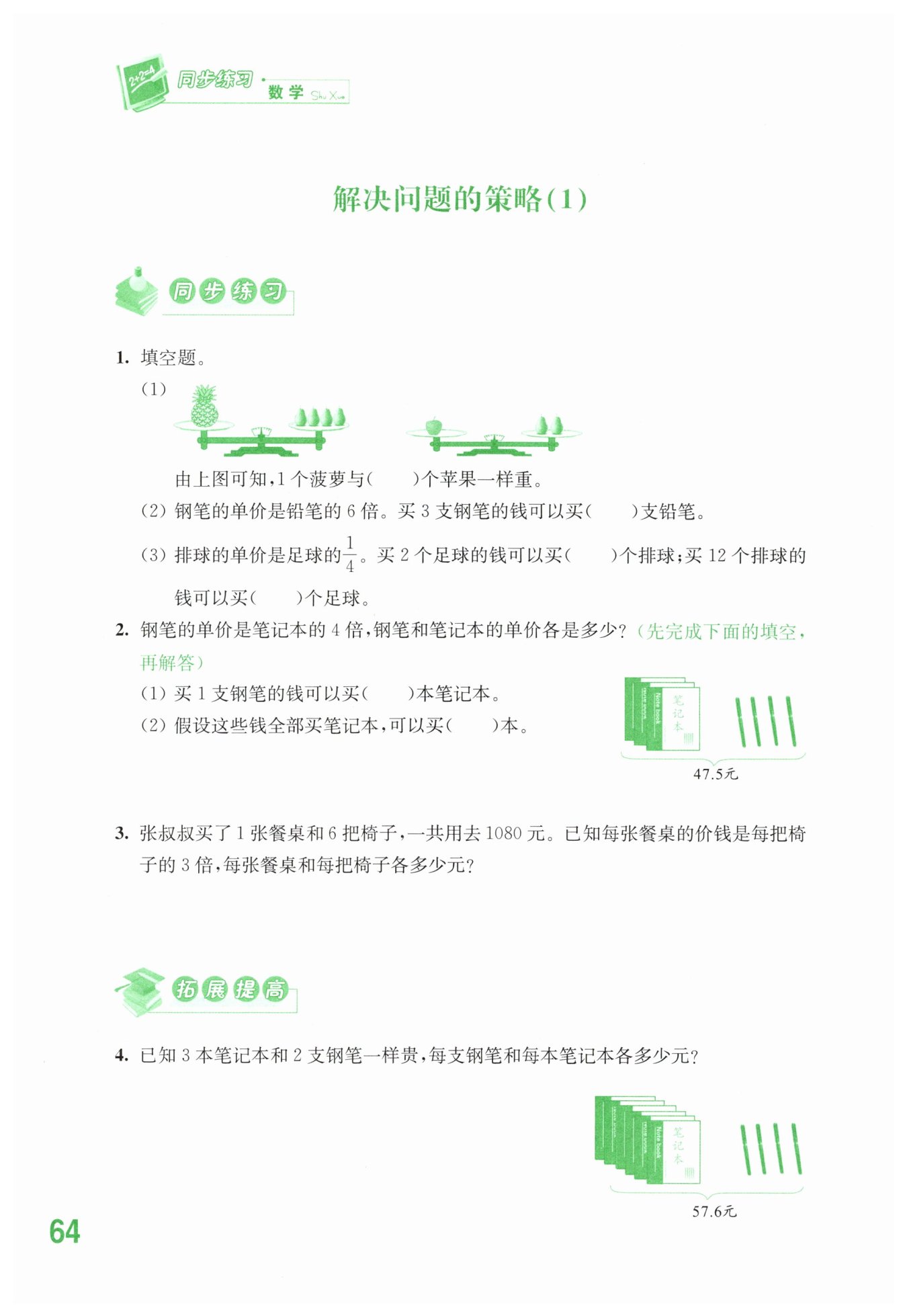 筆記本:57.6÷(6+4÷2×3)=4.8 (元) 鋼筆:4.8×3÷2=7.2 (元) 答:每支鋼筆7.2元,每本筆記本4.8元。