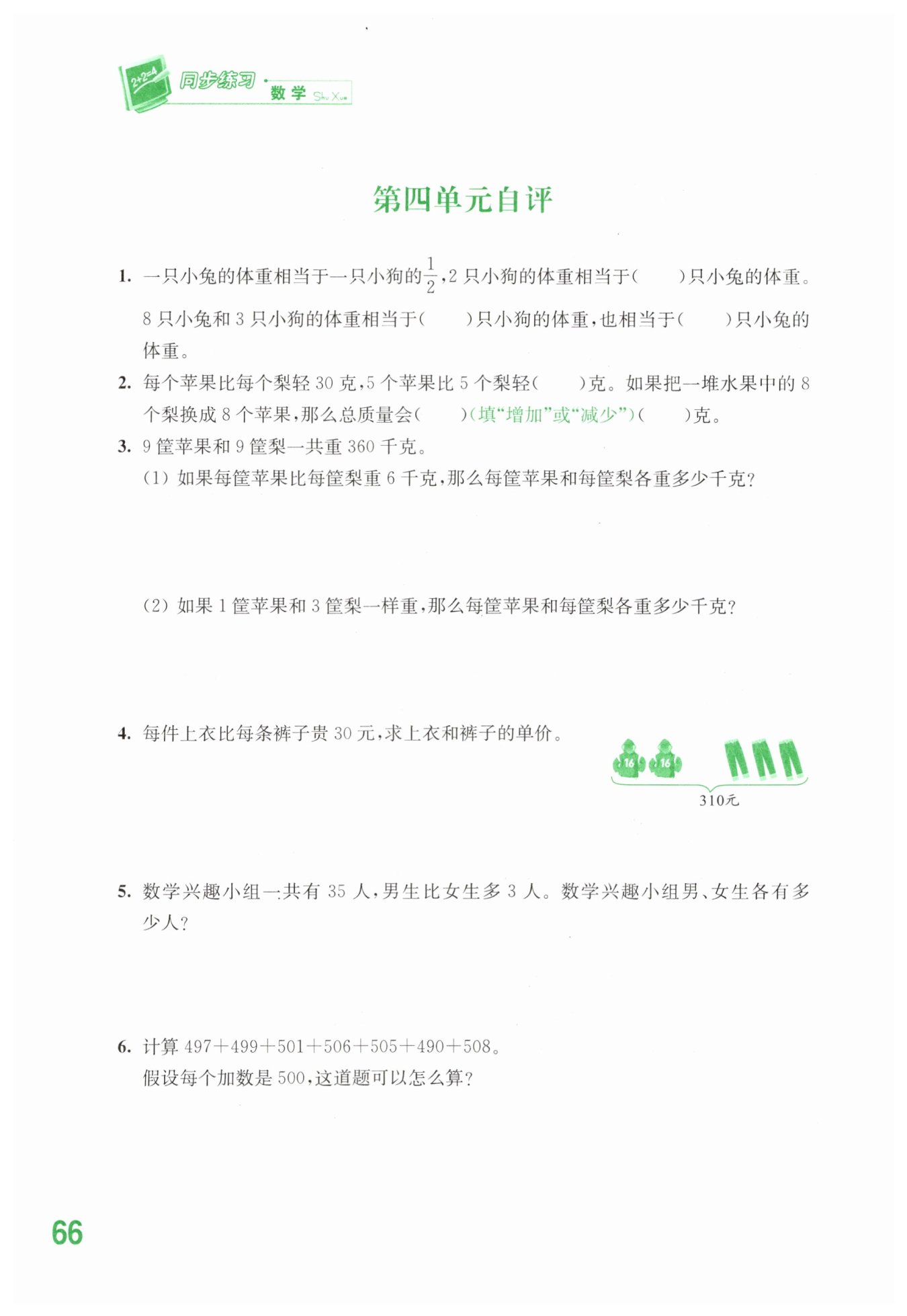 上衣:(310+30×3)÷(2+3)=80 (元) 褲子:80-30=50( 元) 答:上衣的單價是80元,褲子的單價是50元。