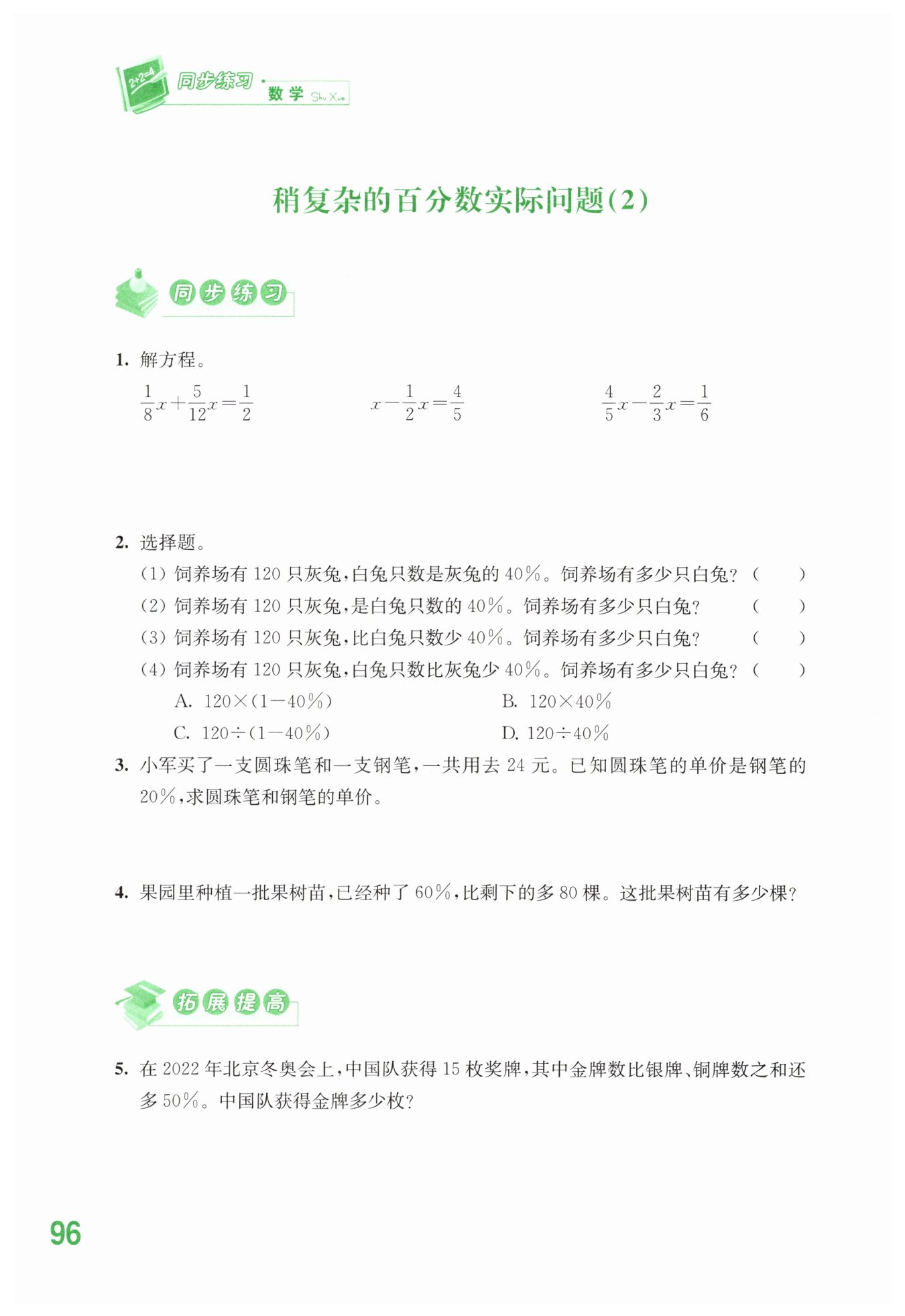 解:設(shè)鋼筆的單價(jià)是x元,圓珠筆的單價(jià)是20%x元。 x+20%x=24 1.2x=24 x=20 20×20%=4(元) 答:圓珠筆的單價(jià)是4元,鋼筆的單價(jià)是20元。