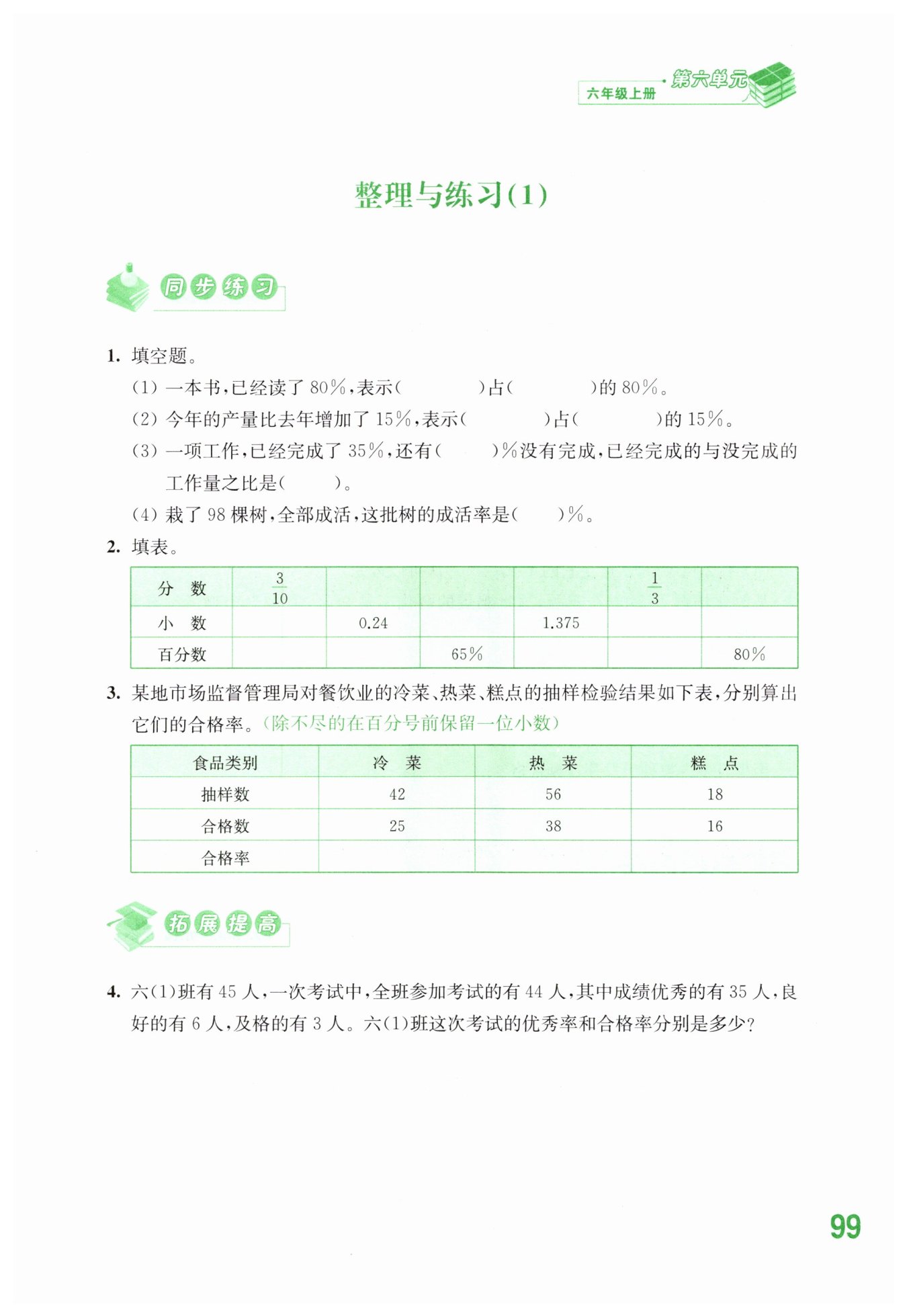 答:六 (1)班這次考試的優(yōu)秀率約是79.5%,合格率是100%。