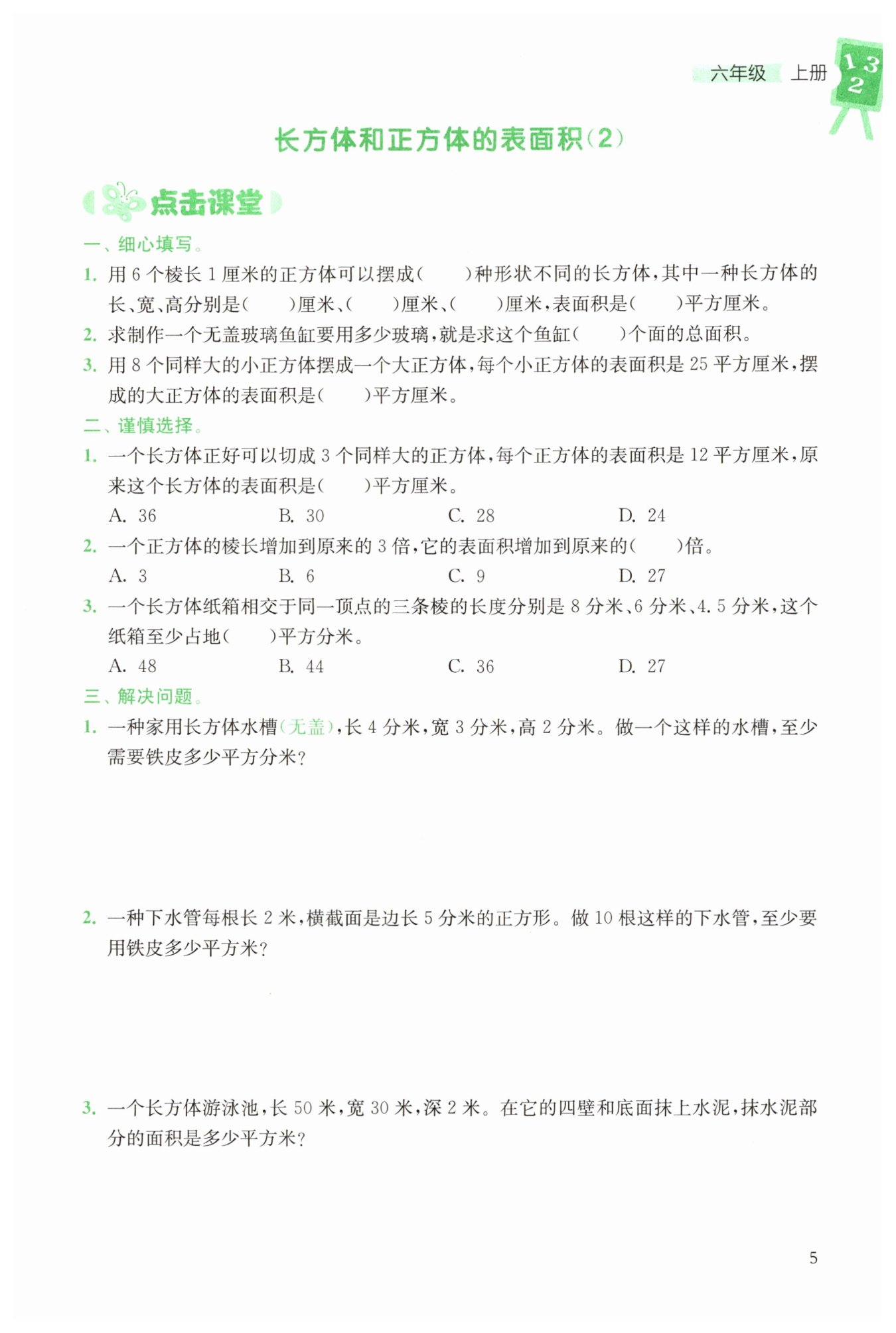 長方體或正方體有6個面,無蓋魚缸缺少一個頂面,所以求制作無蓋玻璃魚缸用多少玻璃,就是求5個面的總面積。