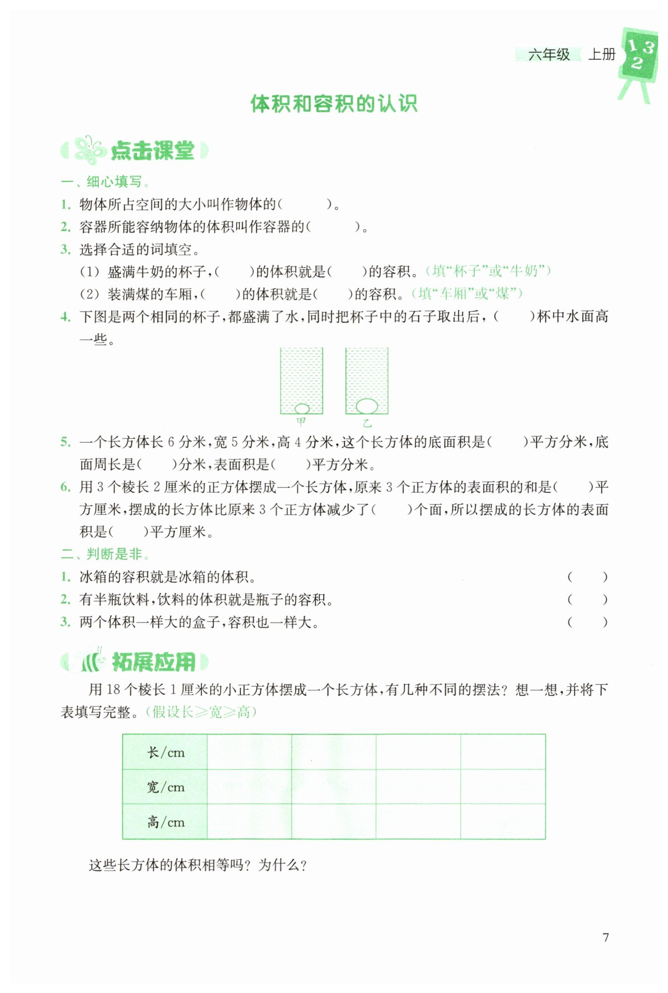 3. 兩個(gè)體積一樣大的盒子,由于盒子的厚度可能不同,從里面測量的長、寬、高也可能不同,因此容積不一定一樣大,所以該說法錯(cuò)誤。