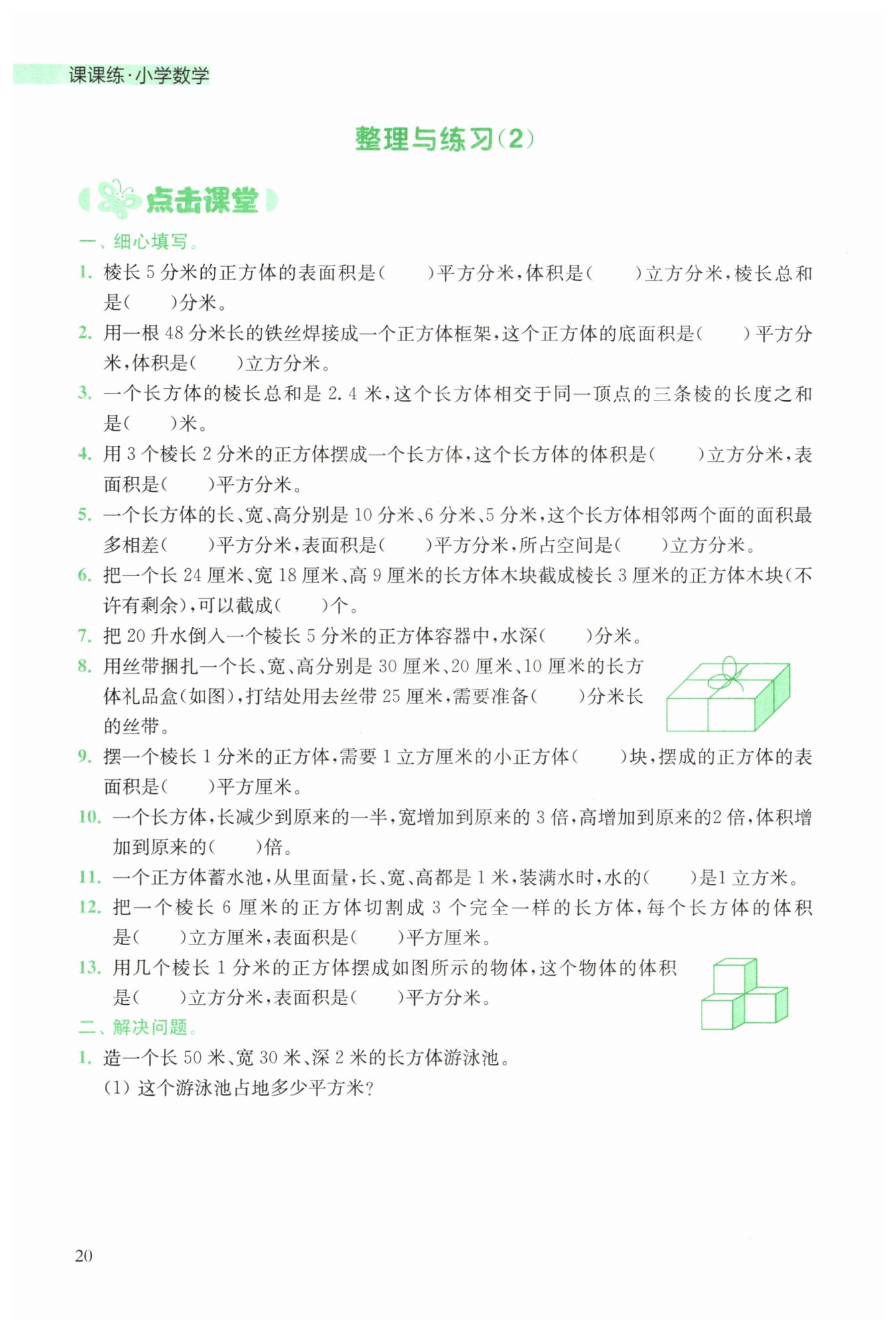 正方體表面積:$6×5^2 = 6×25 = 150$平方分米;體積:$5^3 = 125$立方分米;棱長總和:$12×5 = 60$分米。