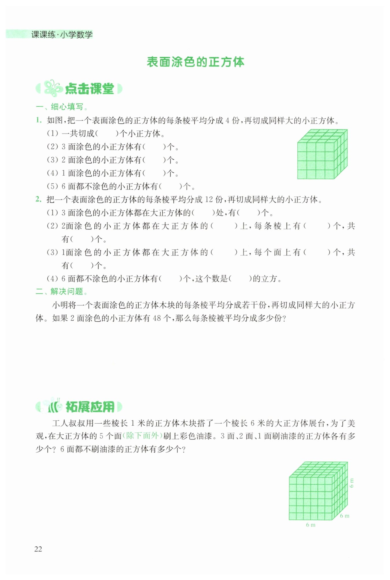 (3) 1面涂色的小正方體都在大正方體的面上。每個面上,去掉邊緣的2行2列,中間是(12-2)×(12-2)=100個小正方體是1面涂色的。因為正方體有6個面,所以共有100×6=600個1面涂色的小正方體。