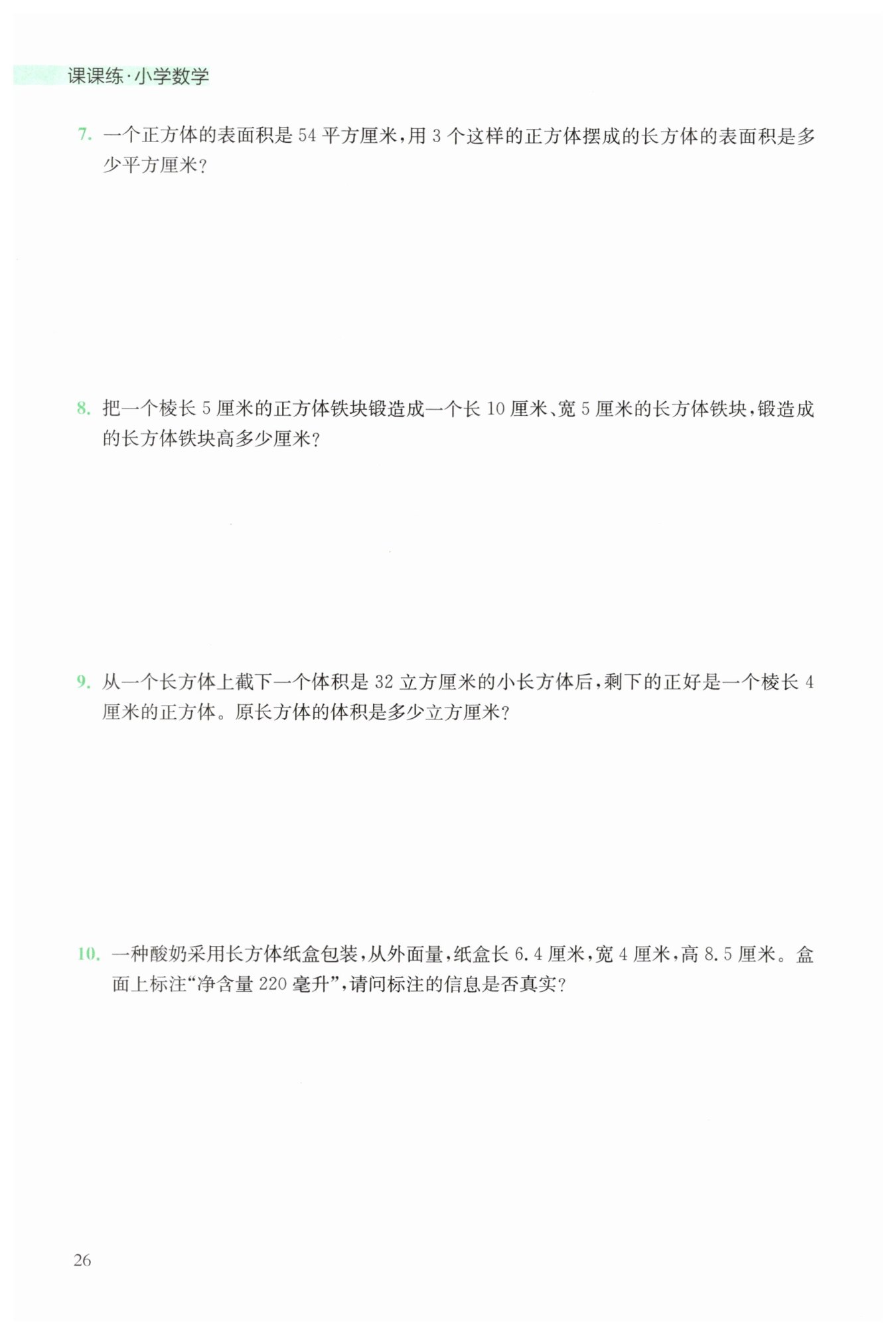正方體的體積為$5\times5\times5 = 125$(立方厘米),因為鍛造前后體積不變,所以長方體的體積也是125立方厘米。長方體的高 = 體積÷(長×寬),即$125\div(10\times5)=125\div50 = 2.5$(厘米)。答:長方體鐵塊高2.5厘米。