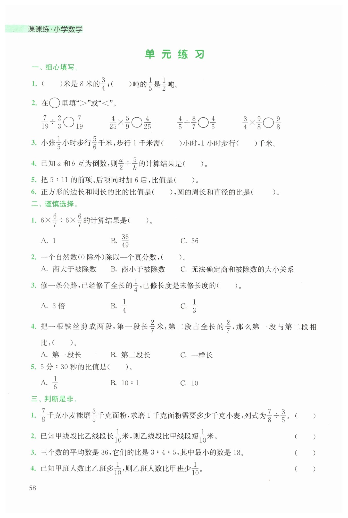 一個數(shù)(0除外)除以一個小于1的數(shù),商大于這個數(shù);除以一個大于1的數(shù),商小于這個數(shù)。一個數(shù)(0除外)乘一個小于1的數(shù),積小于這個數(shù);乘一個大于1的數(shù),積大于這個數(shù)。
