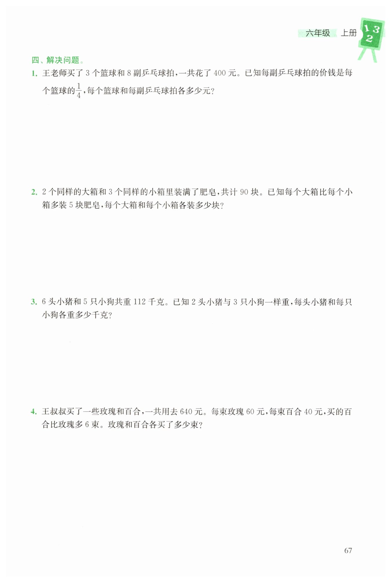 設(shè)每個(gè)籃球的價(jià)錢為$x$元,則每副乒乓球拍的價(jià)錢為$\frac{1}{4}x$元。