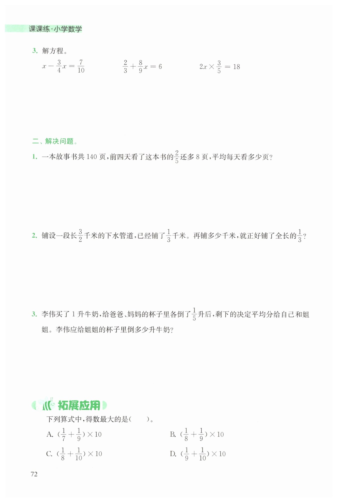 比較每個選項括號內(nèi)兩個分?jǐn)?shù)的和,和越大則整體得數(shù)越大。$\frac{1}{7}>\frac{1}{8}>\frac{1}{9}>\frac{1}{10}$,A選項括號內(nèi)為$\frac{1}{7}+\frac{1}{9}$,B為$\frac{1}{8}+\frac{1}{9}$,C為$\frac{1}{8}+\frac{1}{10}$,D為$\frac{1}{9}+\frac{1}{10}$。顯然$\frac{1}{7}+\frac{1}{9}$最大,故A選項得數(shù)最大。