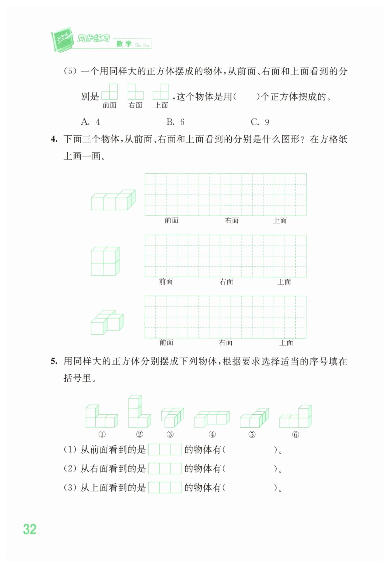 (1)從前面觀察,物體④⑤呈現(xiàn)一行三列的正方形;(2)從右面觀察,物體③⑤呈現(xiàn)一行三列的正方形;(3)從上面觀察,物體①⑥呈現(xiàn)一行三列的正方形。