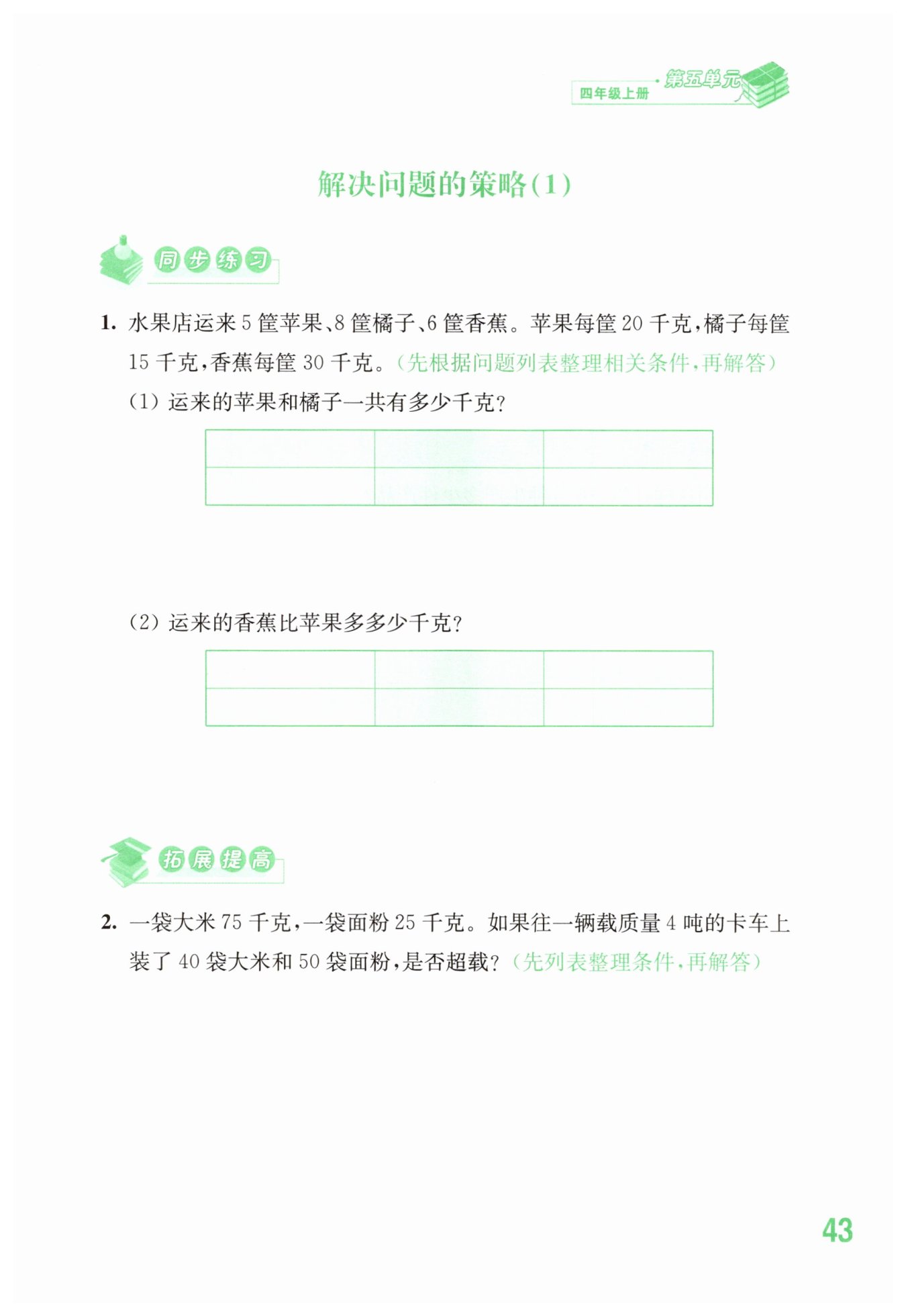 然后計(jì)算總質(zhì)量:大米的總質(zhì)量為$40×75 = 3000$千克,面粉的總質(zhì)量為$50×25 = 1250$千克,所以總質(zhì)量為$3000 + 1250 = 4250$千克。
