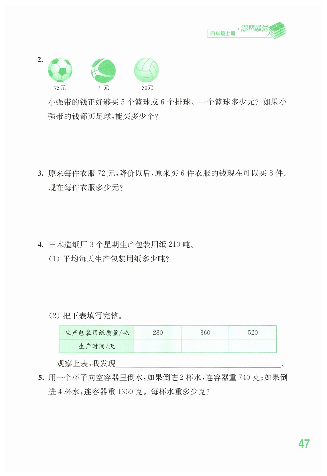 2. 求一個籃球的價格:總錢數(shù)300元能買5個籃球,所以一個籃球的價格為 $300÷5 = 60$ 元。