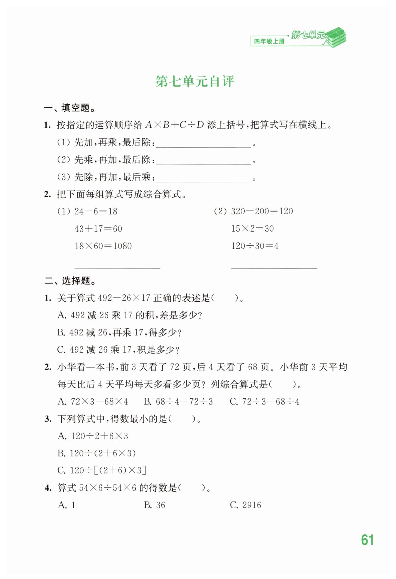(2) 對于第二組算式,首先觀察到 320-200=120 和 15×2=30 是兩個獨立的算式,它們的計算結(jié)果分別是 120 和 30。接著,120÷30=4 是將前兩個算式的結(jié)果相除。因此,可以將這三個算式合并為一個綜合算式,即 (320-200)÷(15×2)。