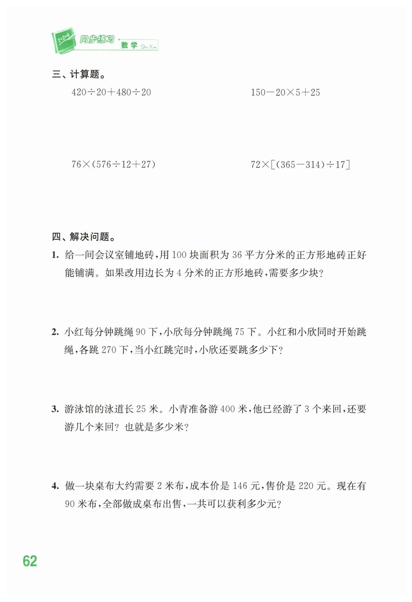 首先計算已經(jīng)游過的距離,1個來回是$25×2 = 50$米,3個來回游了$25×3×2 = 150$米。然后計算還需要游的距離:$400 - 150 = 250$米。接下來計算還要游的來回數(shù),每個來回50米,所以$250÷(25×2) = 250÷50 = 5$個。答:還要游5個來回,也就是250米。