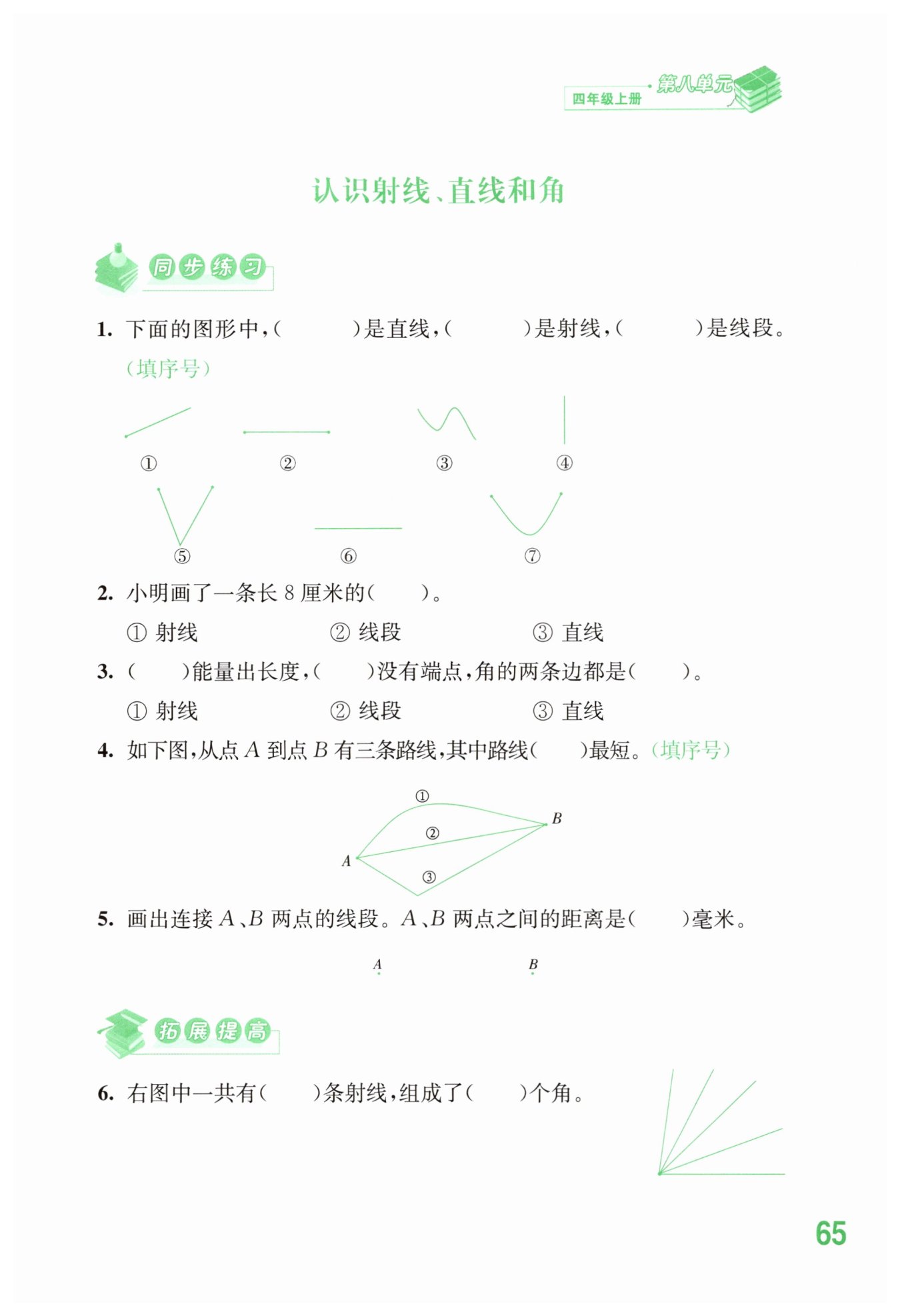 線段有兩個(gè)端點(diǎn),能量出長度;直線沒有端點(diǎn),能向兩端無限延伸;角的兩條邊都是射線,有一個(gè)端點(diǎn),能向一端無限延伸。所以依次填②、③、①。