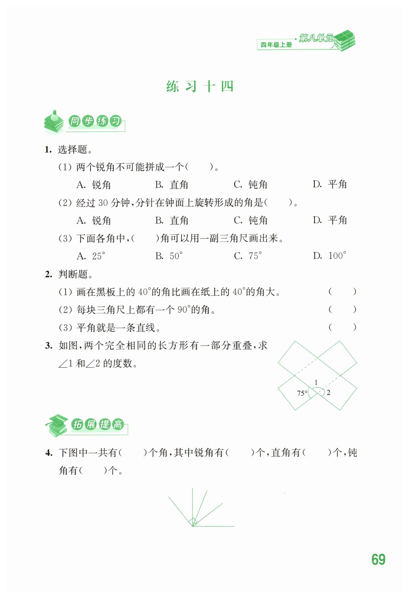 (3)一副標(biāo)準(zhǔn)的三角尺通常包括30-60-90度和45-45-90度的三角形。通過組合這兩個三角形,我們可以得到一些特定的角度。例如,30度+45度=75度。而25度、50度和100度不能通過三角尺上的角度組合得到。所以答案為C。
