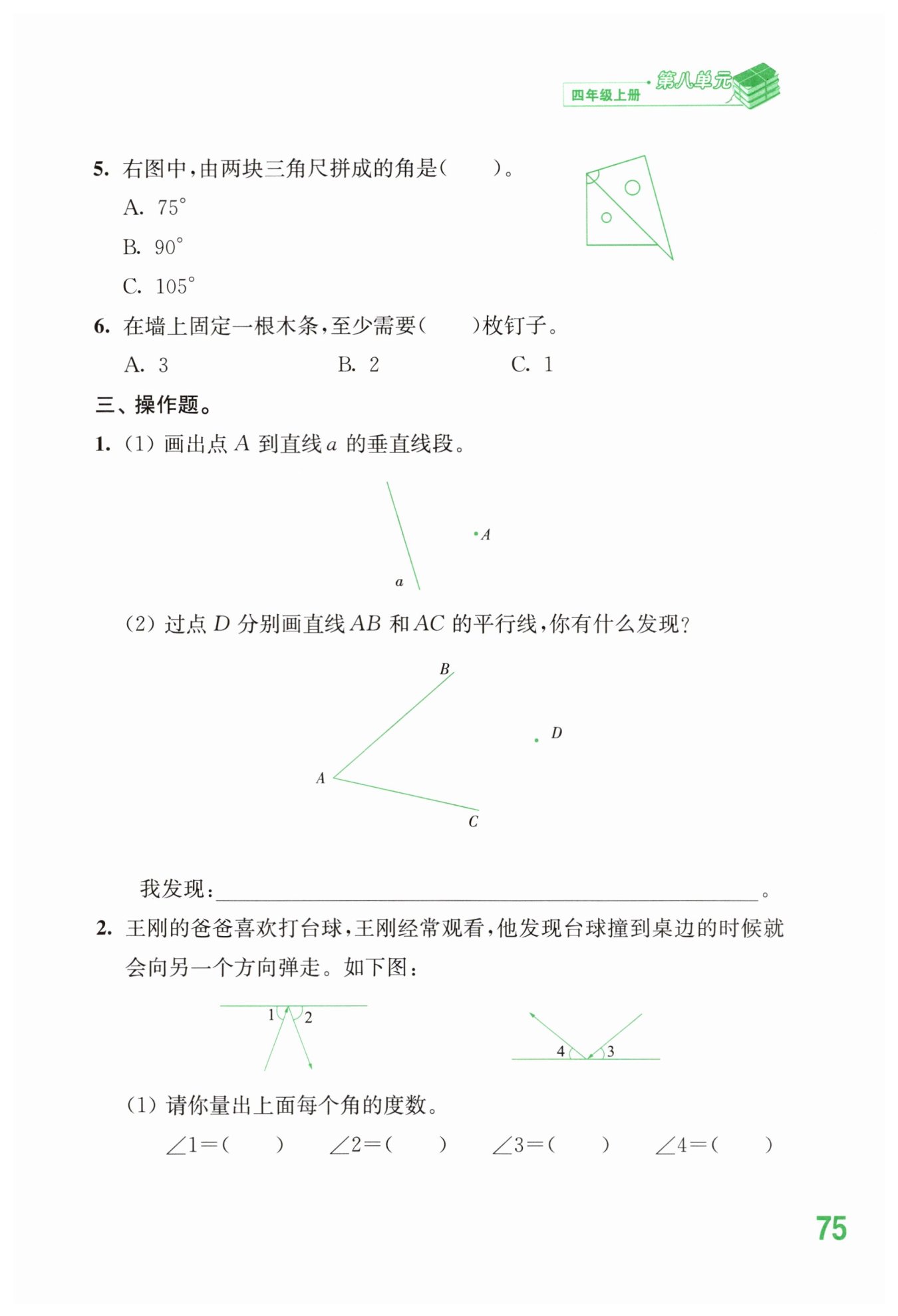 兩塊三角尺的度數(shù)分別為:$30^\circ$、$60^\circ$、$90^\circ$和$45^\circ$、$45^\circ$、$90^\circ$。圖中拼成的角由$60^\circ$和$45^\circ$組成,$60^\circ + 45^\circ = 105^\circ$。