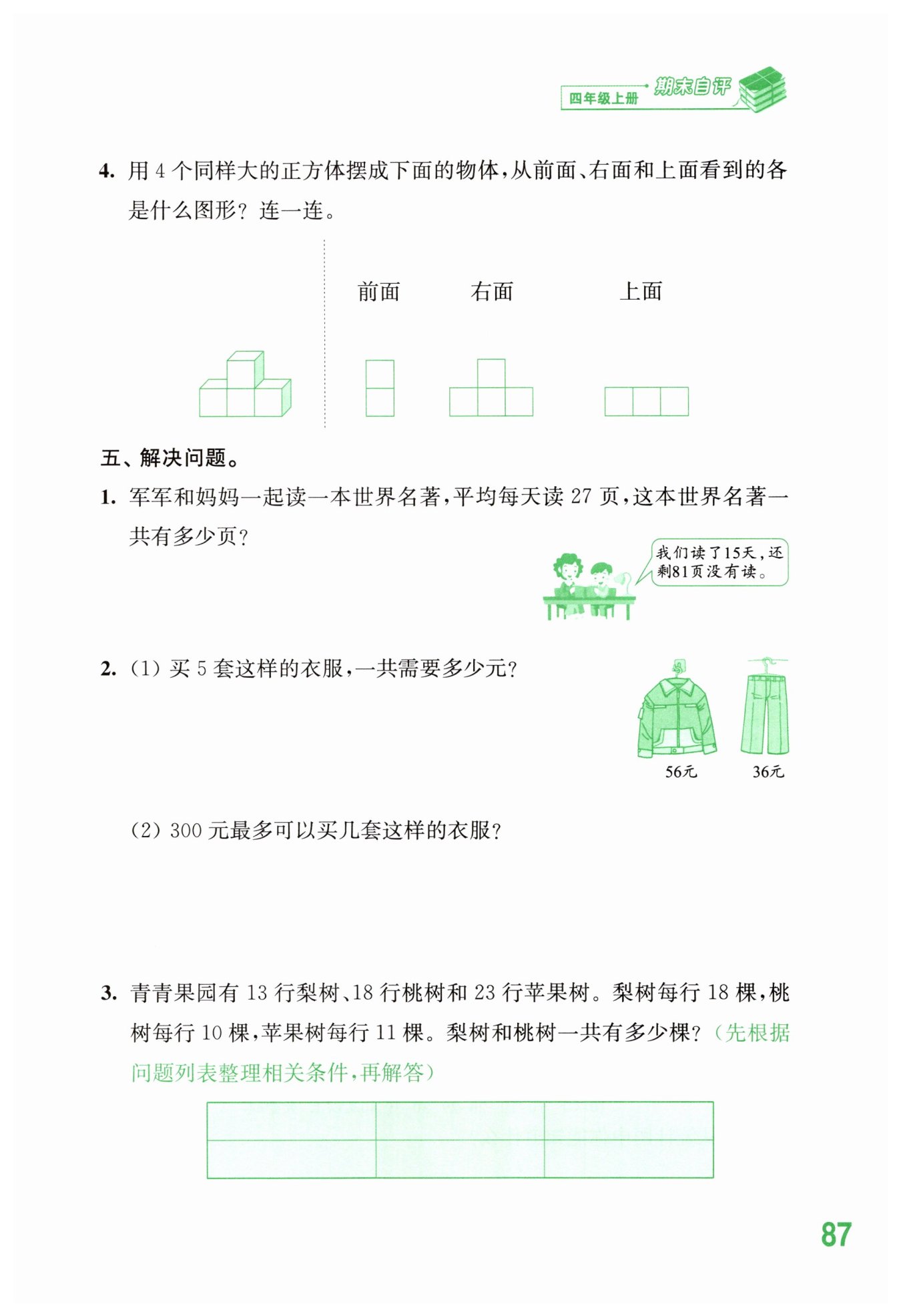 我們先計(jì)算已經(jīng)讀的頁數(shù),平均每天讀27頁,讀了15天,所以已讀頁數(shù)為$27\times15$頁。再加上還沒讀的81頁,就是這本書的總頁數(shù)。列式計(jì)算如下: