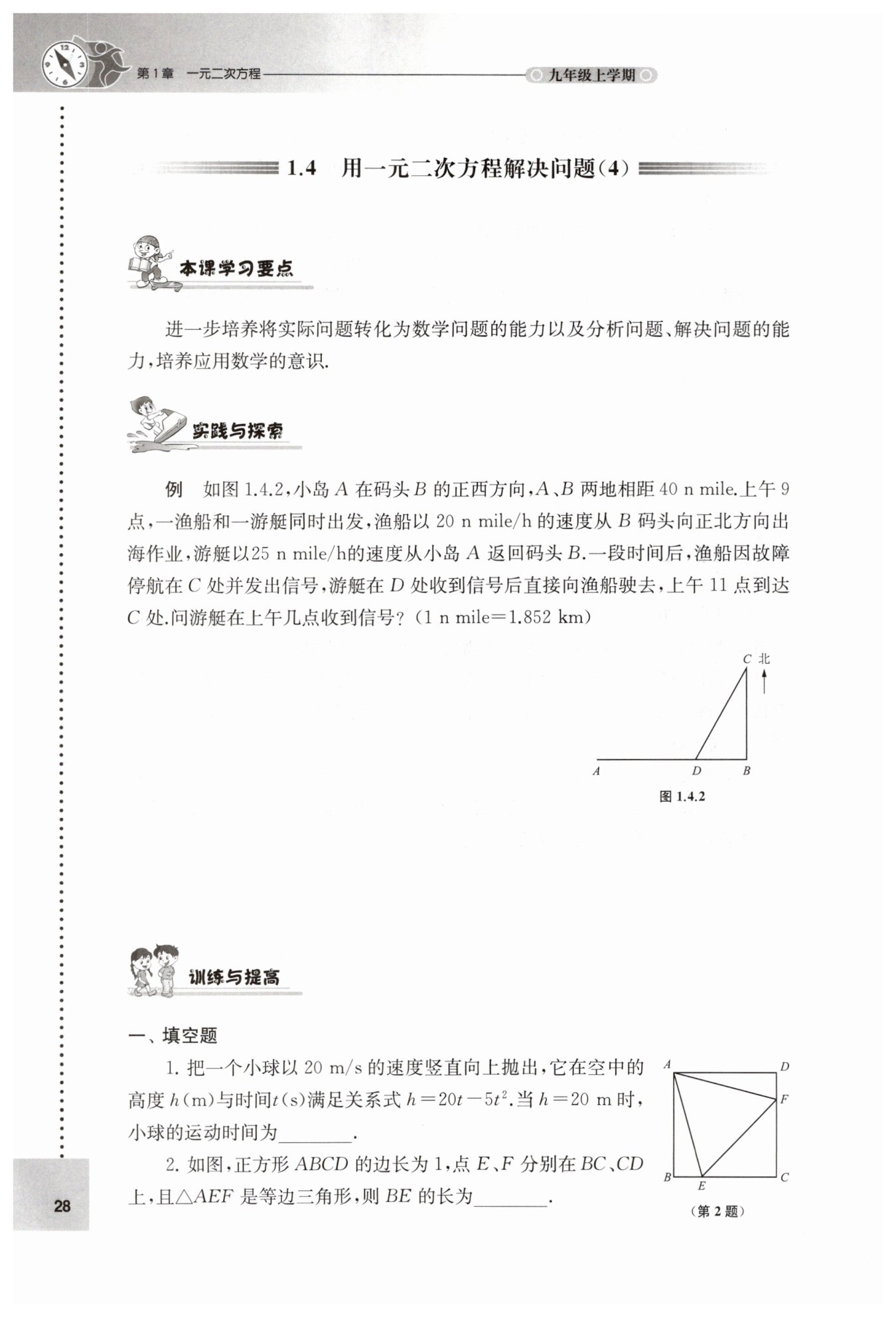 游艇從A到D速度25 n mile/h,行駛時間$ t $小時,所以$ AD=25t $n mile,又$ AB=40 $n mile,故$ DB=AB - AD=40 - 25t $n mile。