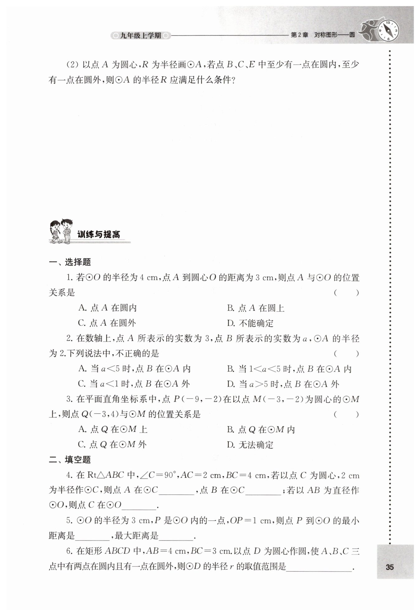 點(diǎn) A 到圓心 C 的距離為 AC=2 cm,等于半徑,所以點(diǎn) A 在⊙C 上;