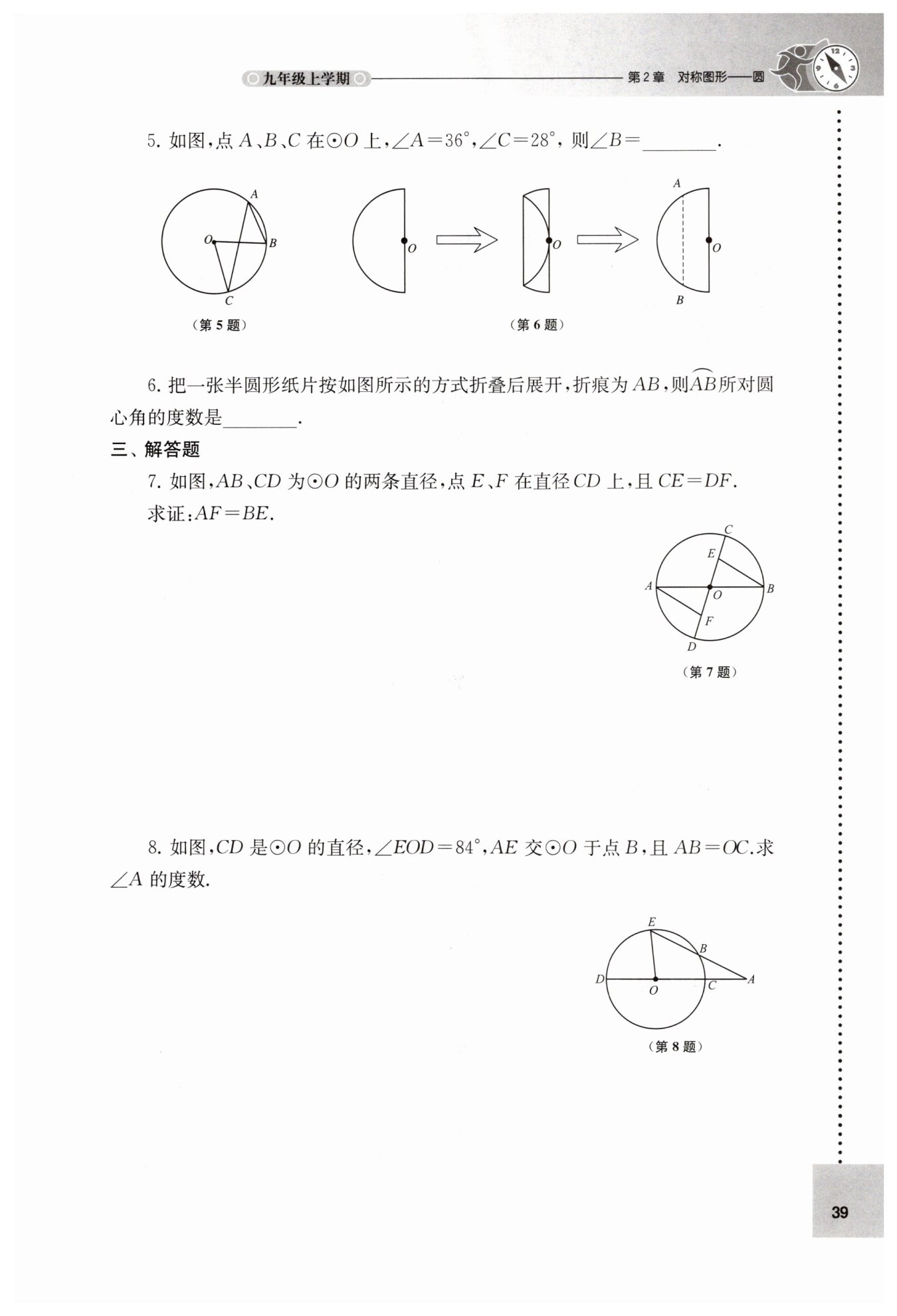 設(shè)半圓的圓心為$O$,半圓的直徑為$CD$,折疊后半圓的圓弧與直徑$CD$相切于點(diǎn)$O$。連接$OA$、$OB$,則$OA=OB$為半圓的半徑。由折疊性質(zhì)知,$AB$垂直平分折疊后圓弧的圓心與點(diǎn)$O$的連線,設(shè)折疊后圓弧的圓心為$O'$,則$OO'\perp AB$,且$OO'=\frac{1}{2}OA$。在$Rt\triangle OO'A$中,$\cos\angle AOO'=\frac{OO'}{OA}=\frac{1}{2}$,所以$\angle AOO' = 60^\circ$,同理$\angle BOO' = 60^\circ$,故$\angle AOB=\angle AOO'+\angle BOO' = 120^\circ$,即$\overset{\frown}{AB}$所對(duì)圓心角的度數(shù)是$120^\circ$。