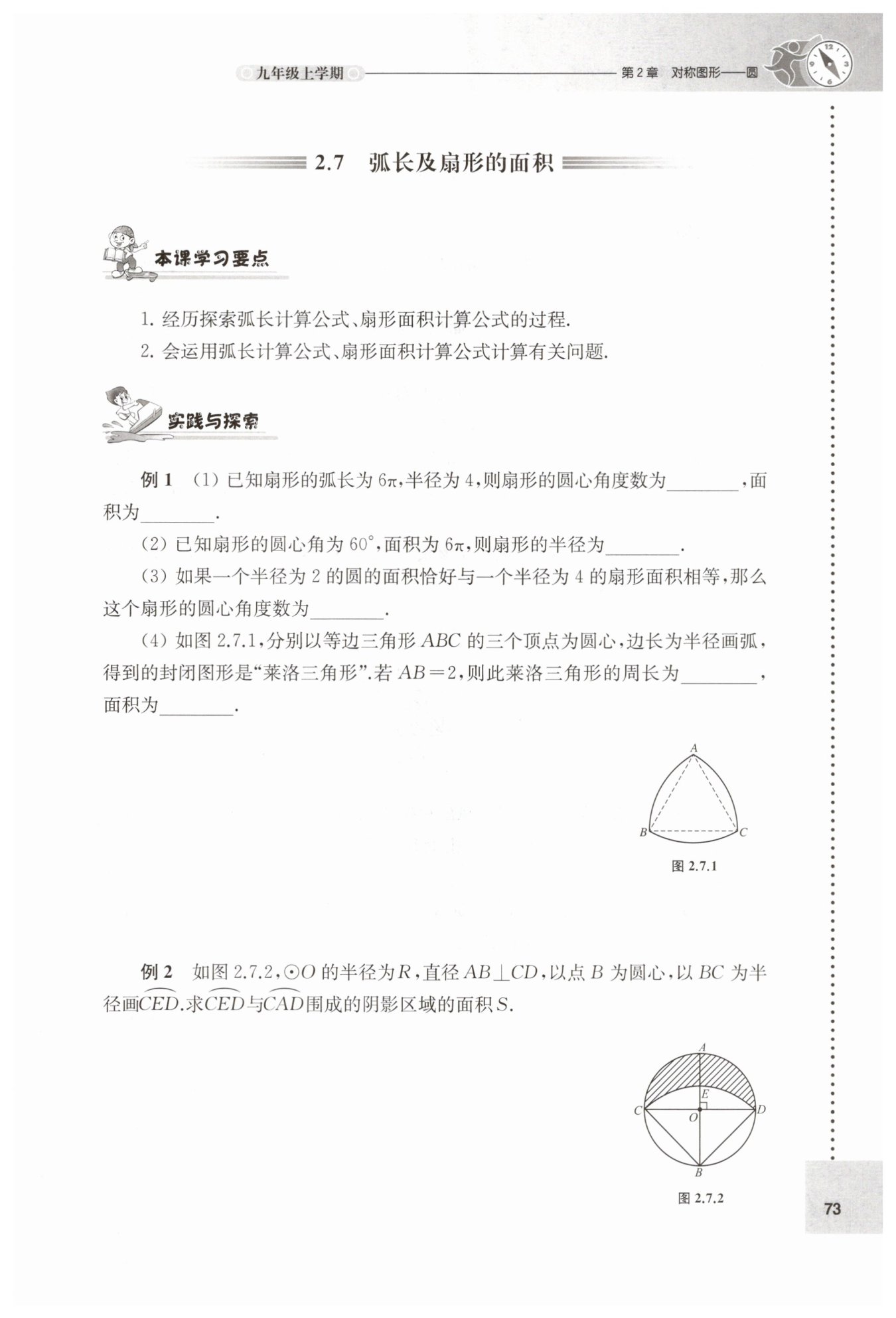 (4)等邊三角形內(nèi)角$60^{\circ}$,每個(gè)弧長(zhǎng)$\frac{60\pi×2}{180}=\frac{2\pi}{3}$,周長(zhǎng)$3×\frac{2\pi}{3}=2\pi$;每個(gè)弓形面積$\frac{60\pi×2^{2}}{360}-\frac{\sqrt{3}}{4}×2^{2}=\frac{2\pi}{3}-\sqrt{3}$,總面積$3×(\frac{2\pi}{3}-\sqrt{3})=2\pi - 3\sqrt{3}$,故答案為$2\pi$,$2\pi - 2\sqrt{3}$。