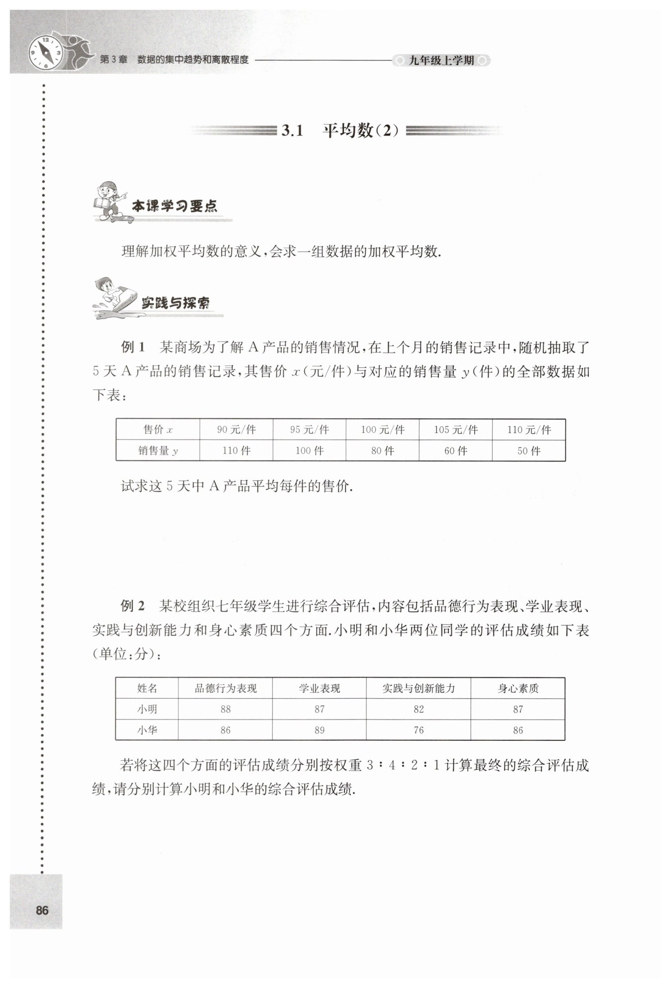 小明的綜合評(píng)估成績(jī):$\frac{88×3 + 87×4 + 82×2 + 87×1}{3+4+2+1} = \frac{264 + 348 + 164 + 87}{10} = \frac{863}{10} = 86.3$分;