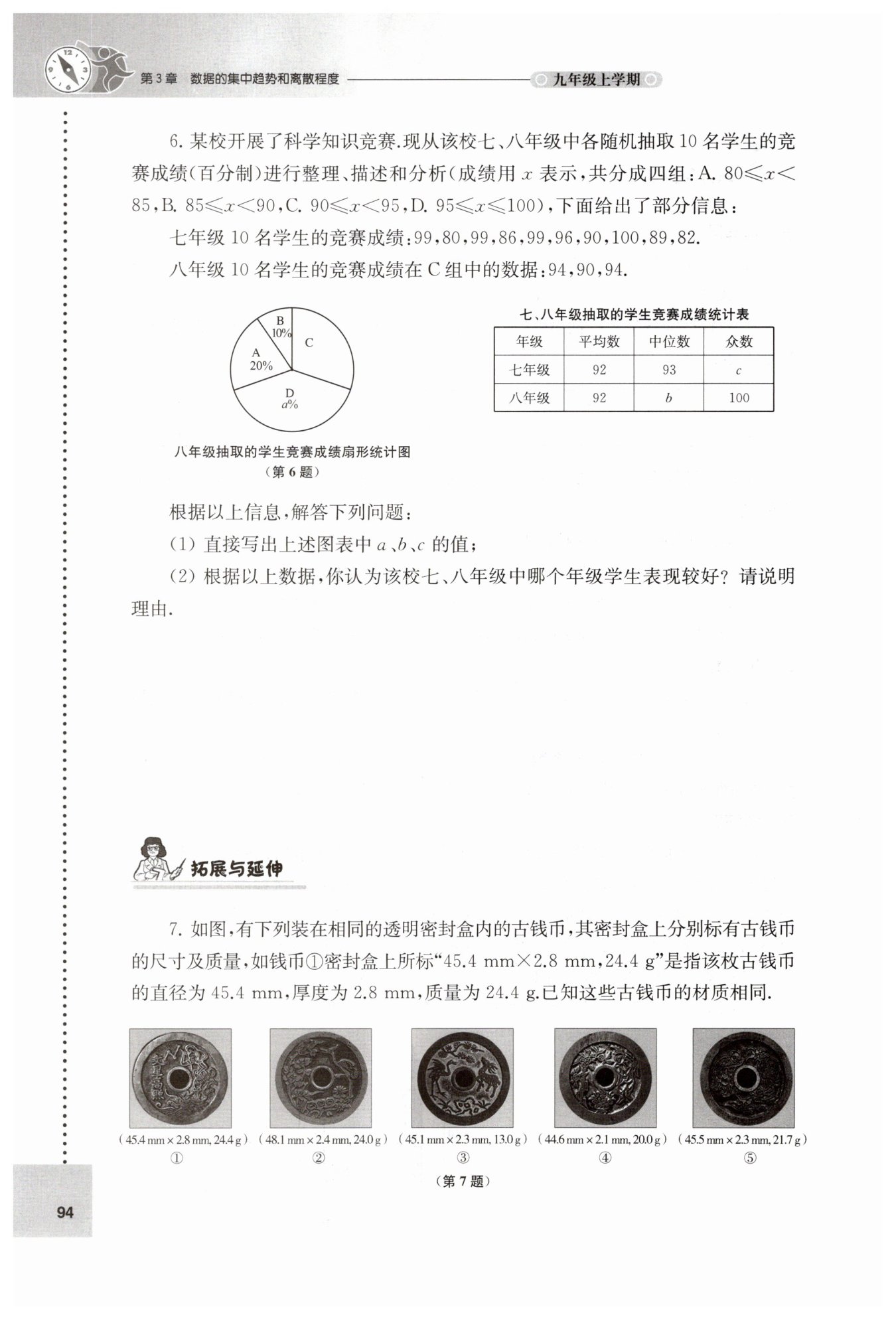 (2)設(shè)密封盒質(zhì)量為$x$g,古錢幣標(biāo)注質(zhì)量總和為$24.4 + 21.7 + 22.3 + 21.9 + 20.6 = 110.9$g,總質(zhì)量總和為$58.7 + 58.1 + 55.2 + 54.3 + 55.8 = 282.1$g,$5x = 282.1 - 110.9$,$x = 34.24$。①實(shí)際質(zhì)量:$58.7 - 34.24 = 24.46$g,②:$58.1 - 34.24 = 23.86$g,③:$55.2 - 34.24 = 20.96\approx21.0$g,④:$54.3 - 34.24 = 20.06$g,⑤:$55.8 - 34.24 = 21.56$g。③差異較大,實(shí)際質(zhì)量約21.0g。