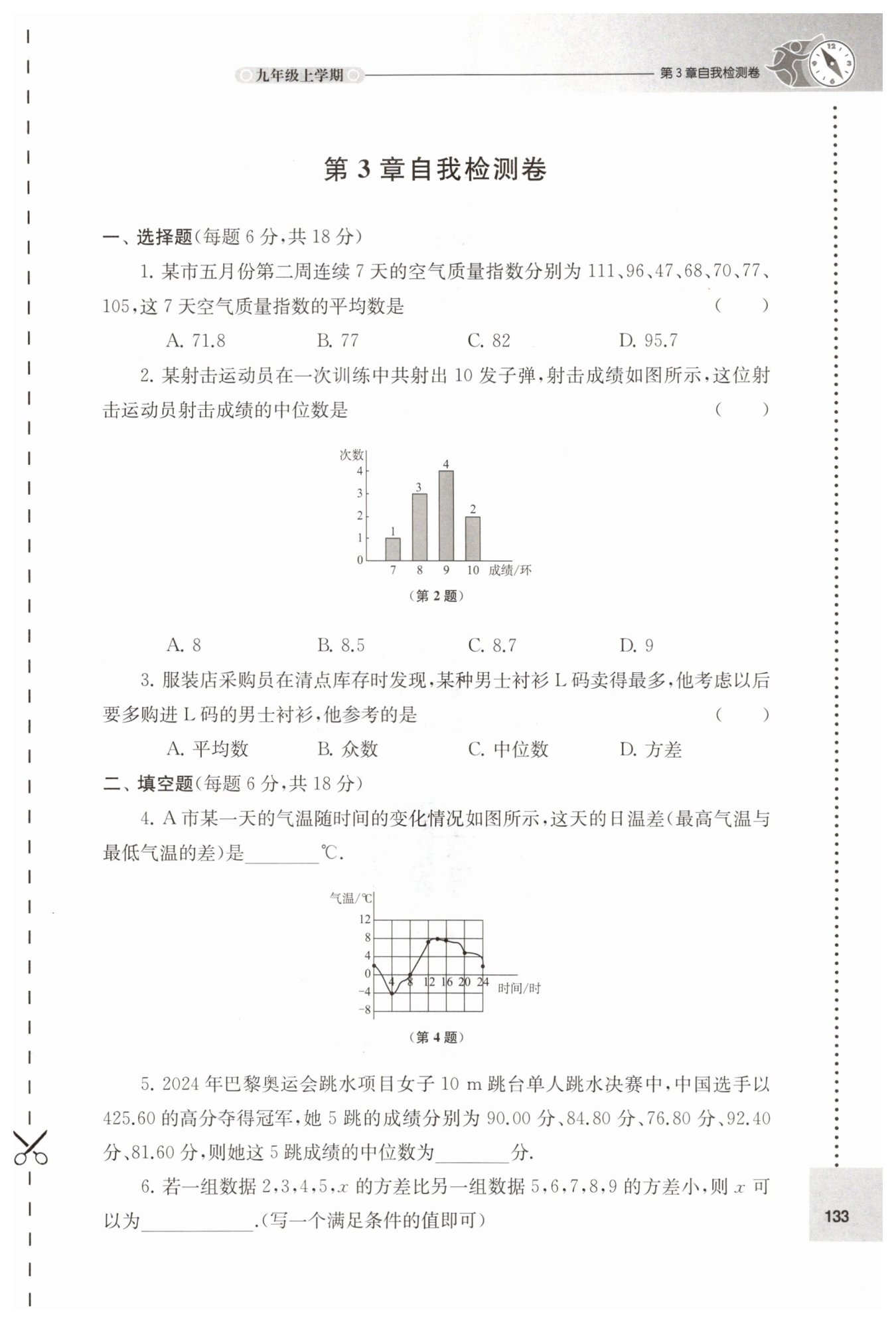 由圖可知,成績?yōu)?環(huán)的有1次,8環(huán)的有3次,9環(huán)的有4次,10環(huán)的有2次,共10次射擊成績。將成績按從小到大排列:7,8,8,8,9,9,9,9,10,10。第5、6個數(shù)據(jù)均為9,中位數(shù)為$\frac{9+9}{2}=9$。