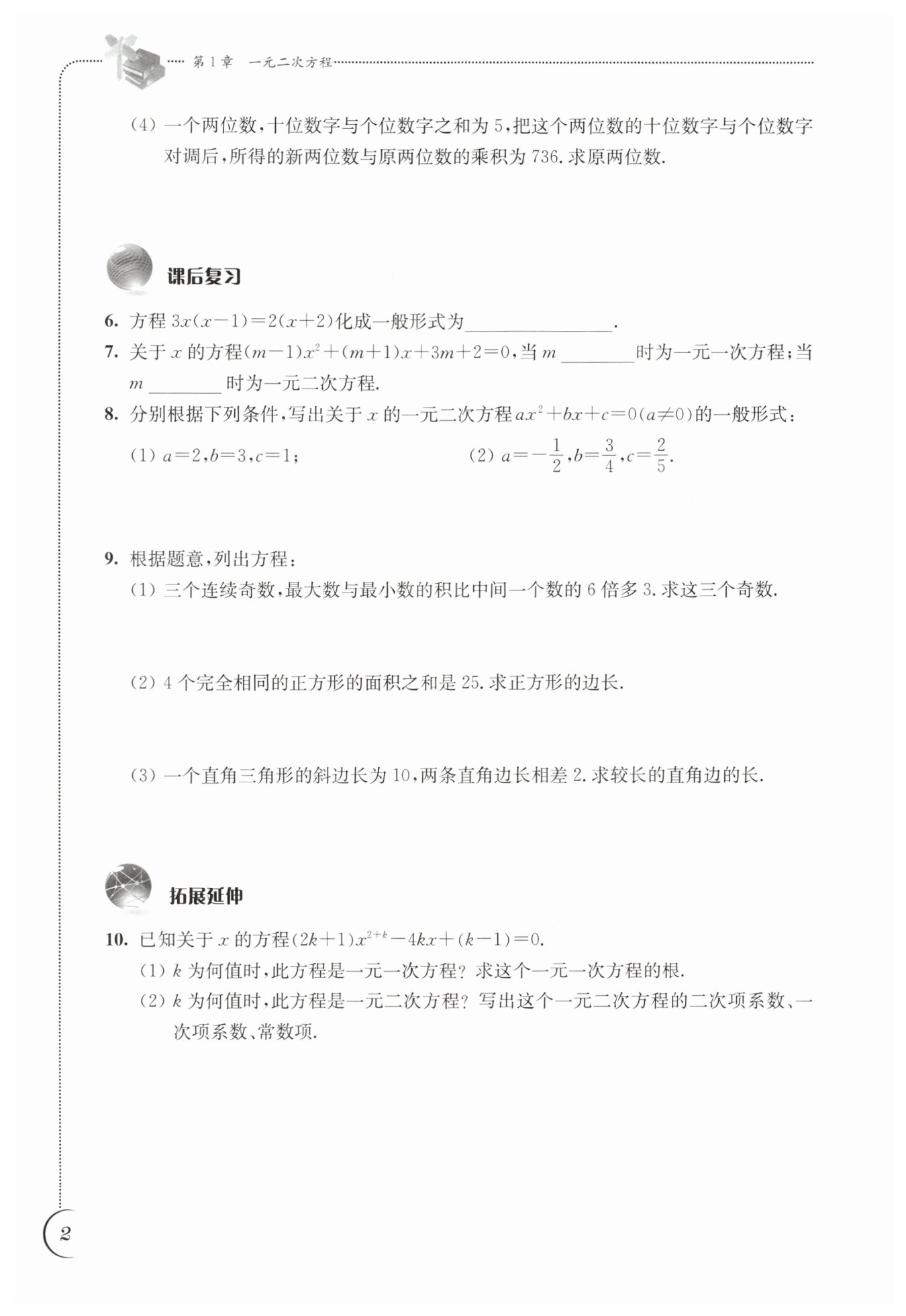 (2)若方程是一元二次方程,則$2 + k = 2$且$2k + 1 \neq 0,$由$2 + k = 2$得$k = 0,$此時(shí)$2k + 1 = 1 \neq 0,$原方程為$x^2 - 1 = 0。$所以二次項(xiàng)系數(shù)為$1,$一次項(xiàng)系數(shù)為$0,$常數(shù)項(xiàng)為$-1。$