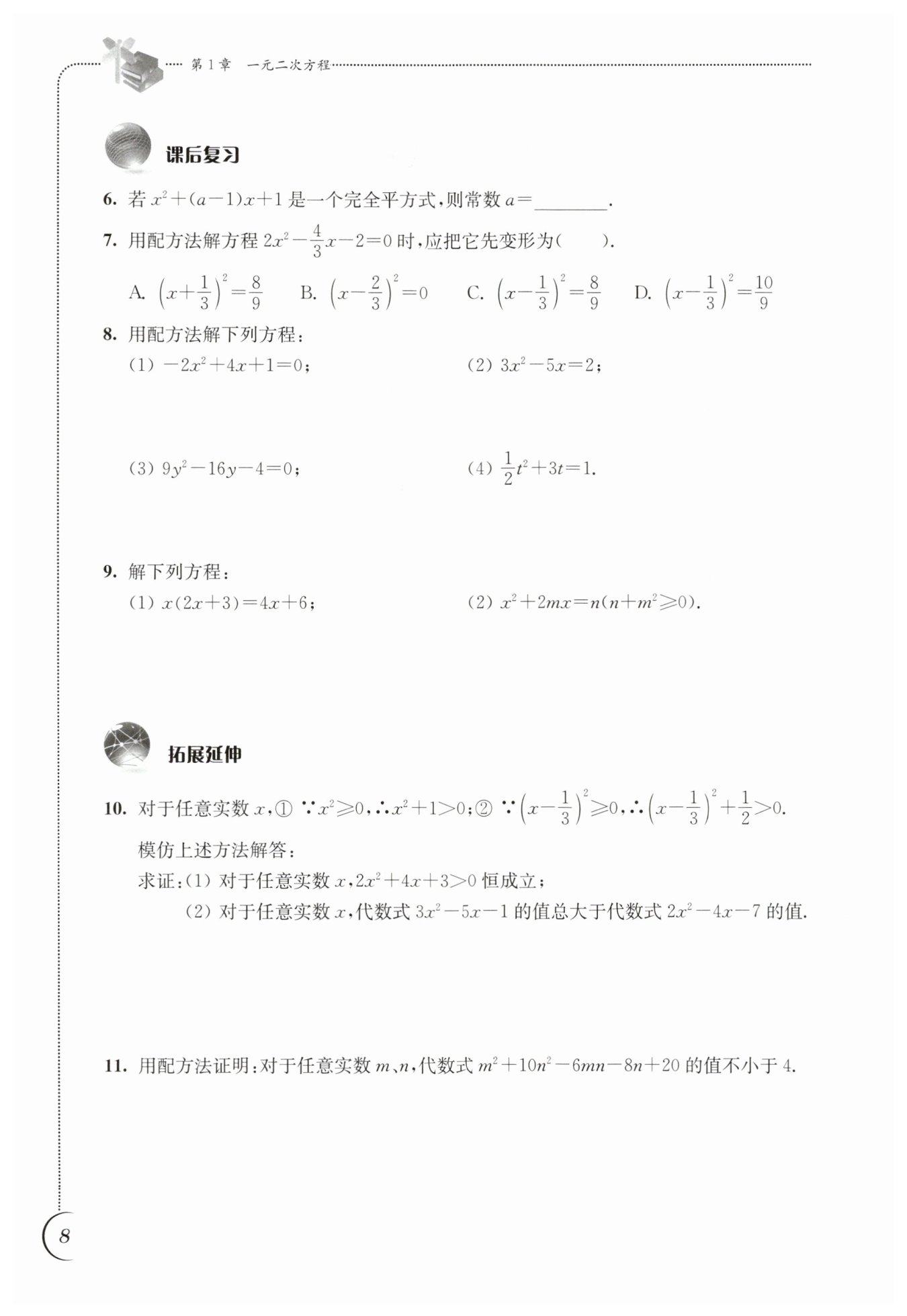 (2)證明:$(3x^{2}-5x-1)-(2x^{2}-4x-7)=3x^{2}-5x-1-2x^{2}+4x+7=x^{2}-x+6,$