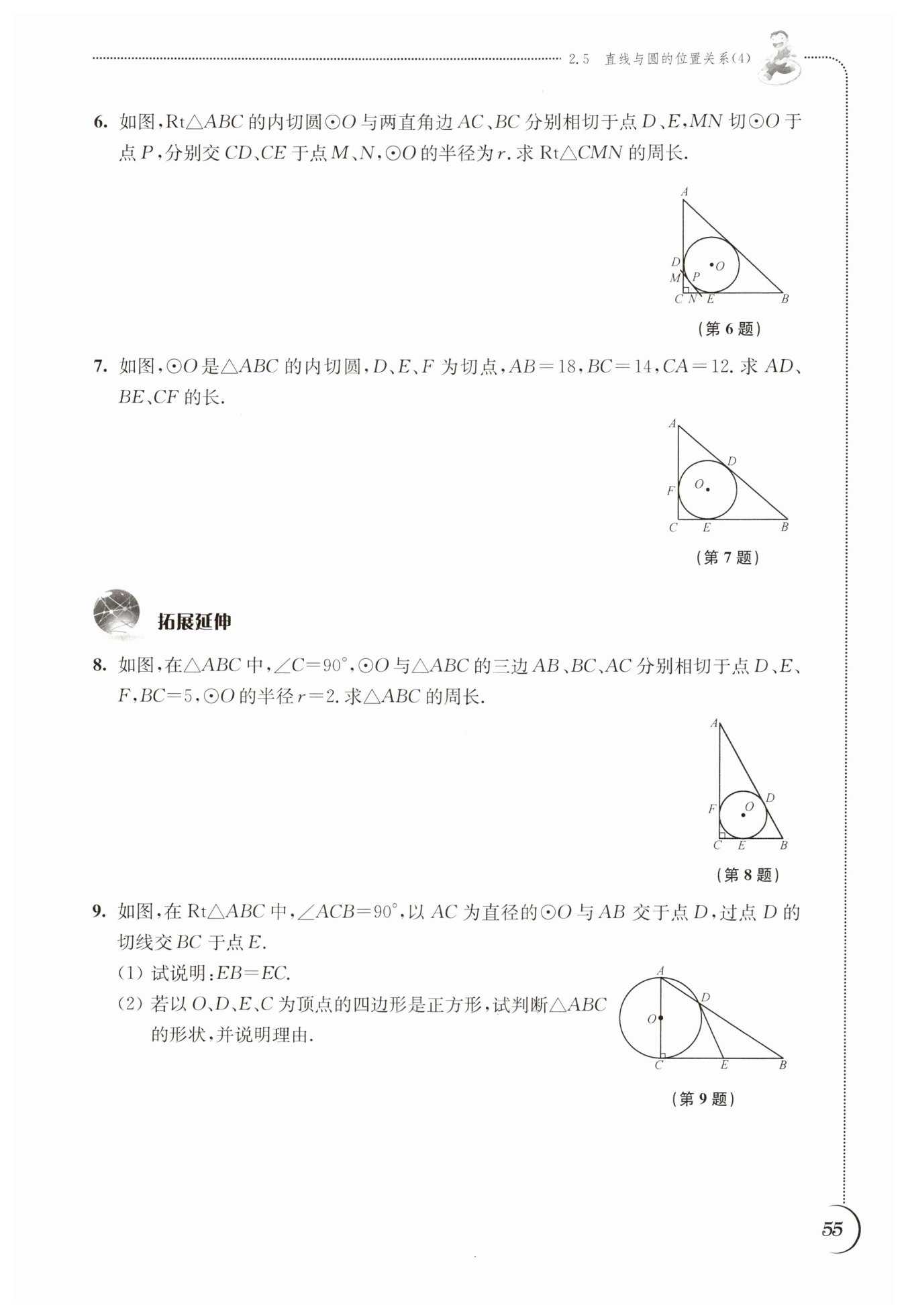 又因?yàn)椤螩 = 90°,所以四邊形OECF為矩形,而OE = OF = r = 2,故四邊形OECF為正方形,因此CE = CF = 2。