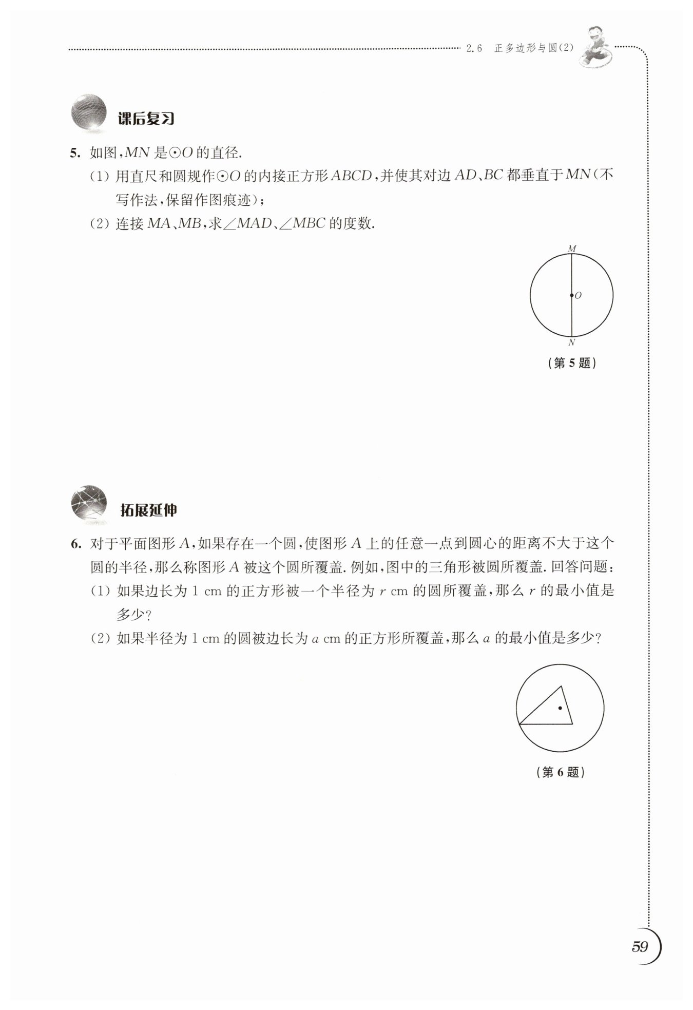 (2)半徑為1 cm的圓被正方形覆蓋,當(dāng)圓為正方形的內(nèi)切圓時(shí),正方形邊長(zhǎng)最小,此時(shí)正方形邊長(zhǎng)等于圓的直徑,即$a = 2\times1 = 2$ cm。