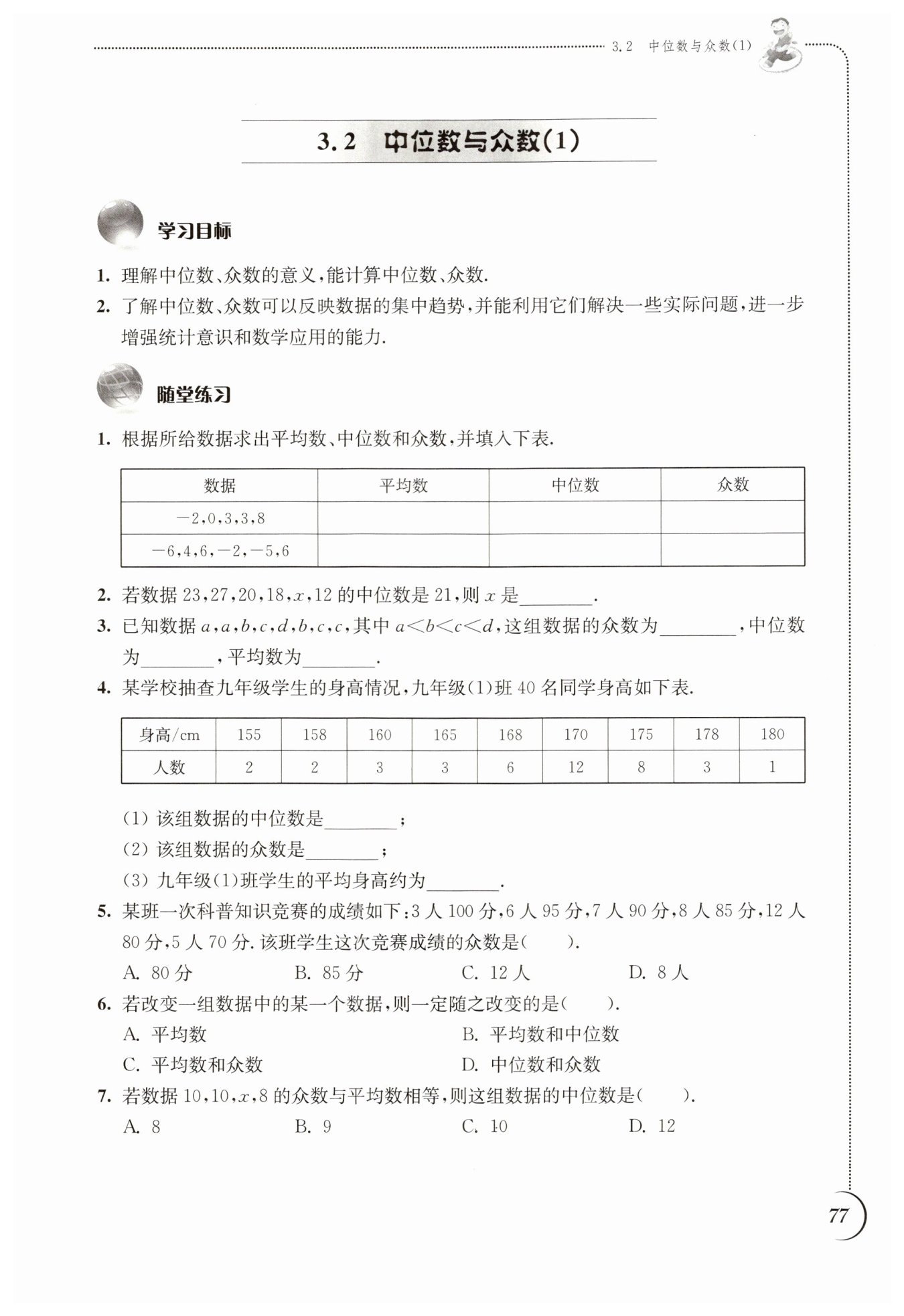 本題主要考查眾數(shù)、平均數(shù)和中位數(shù)的概念及計(jì)算。
