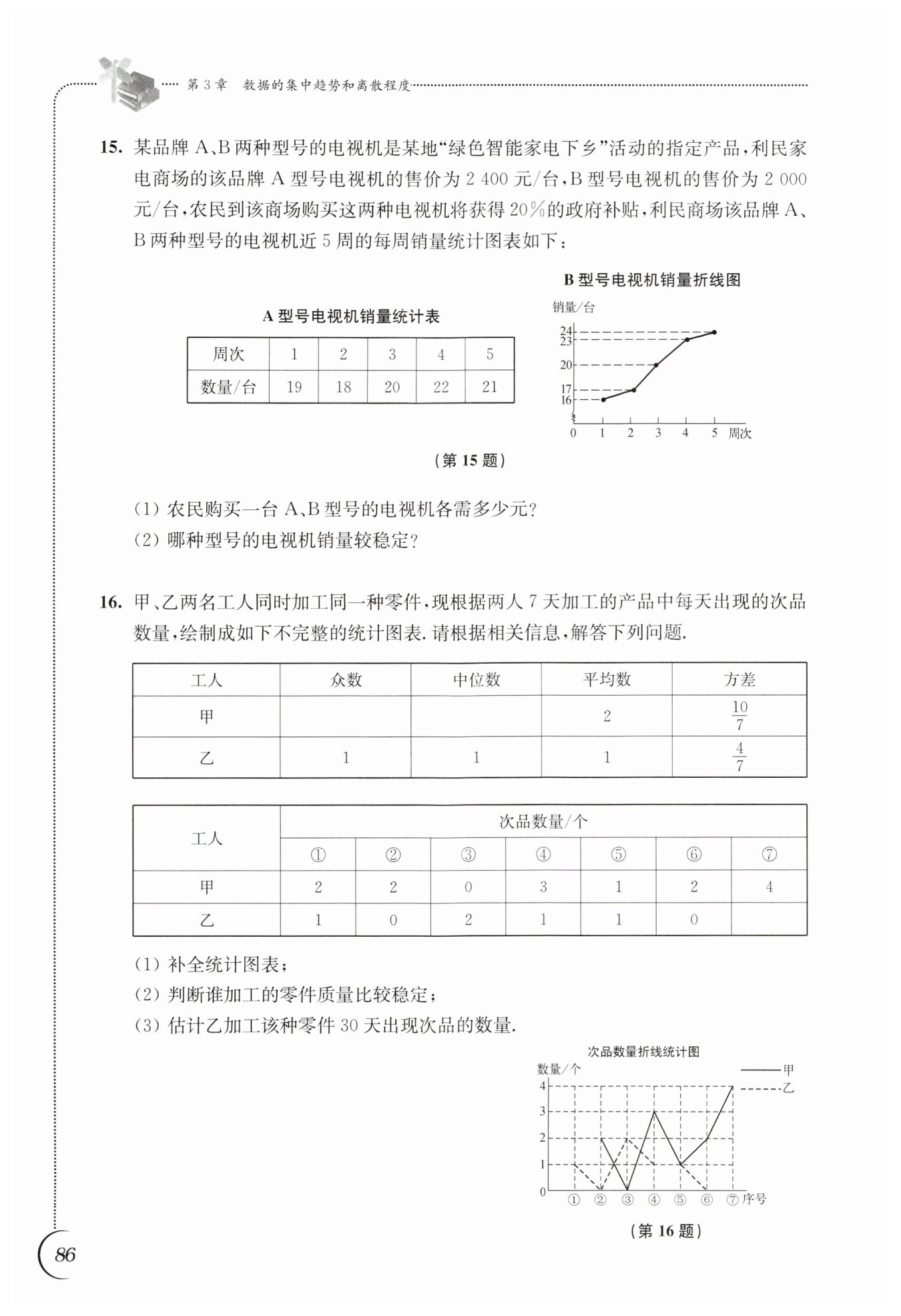 由折線圖可知$B$型號電視機$5$周銷量分別為$16$,$17$,$20$,$23$,$24$。